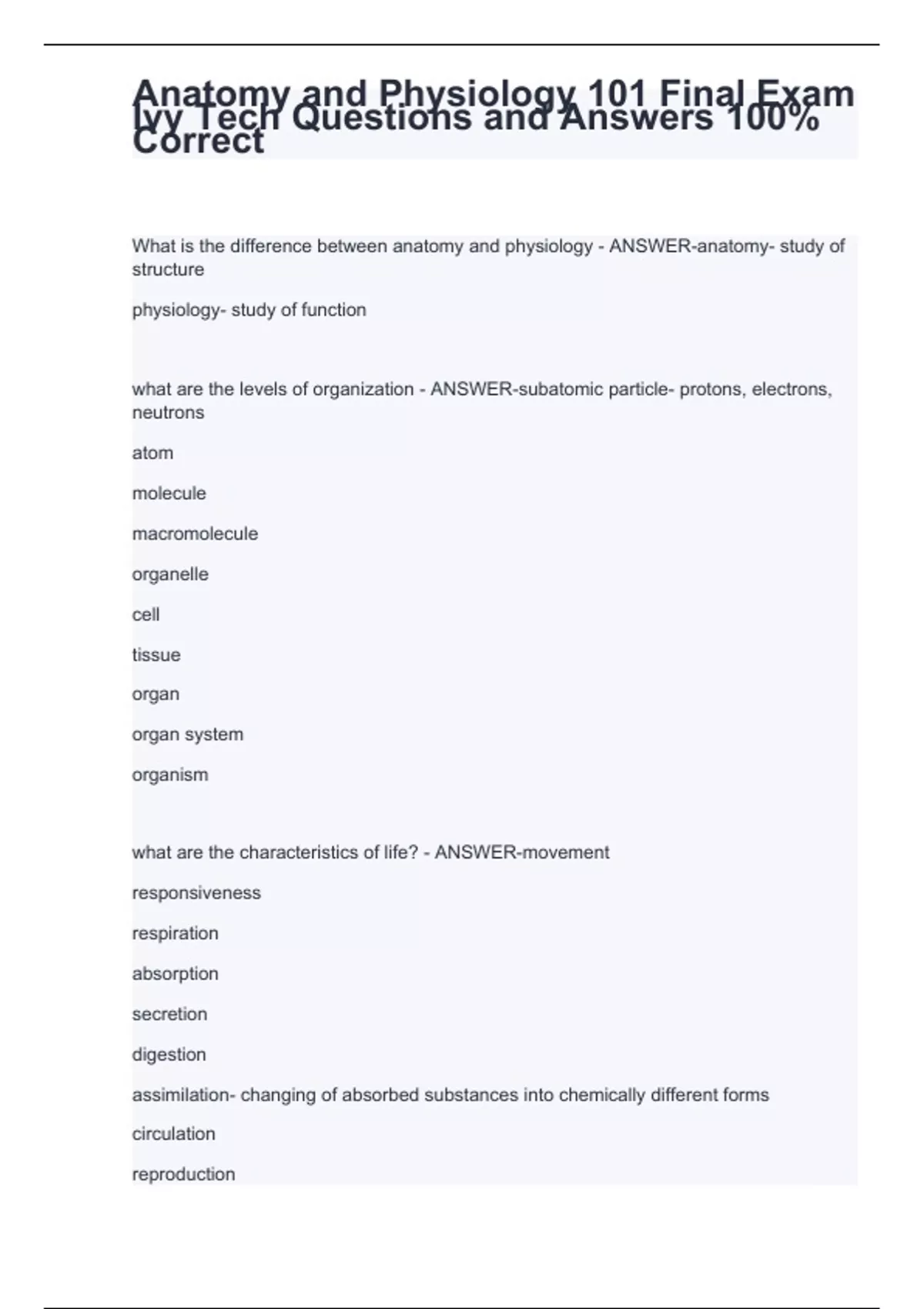 Anatomy and Physiology 101 Final Exam Ivy Tech Questions and Answers 100% Correct