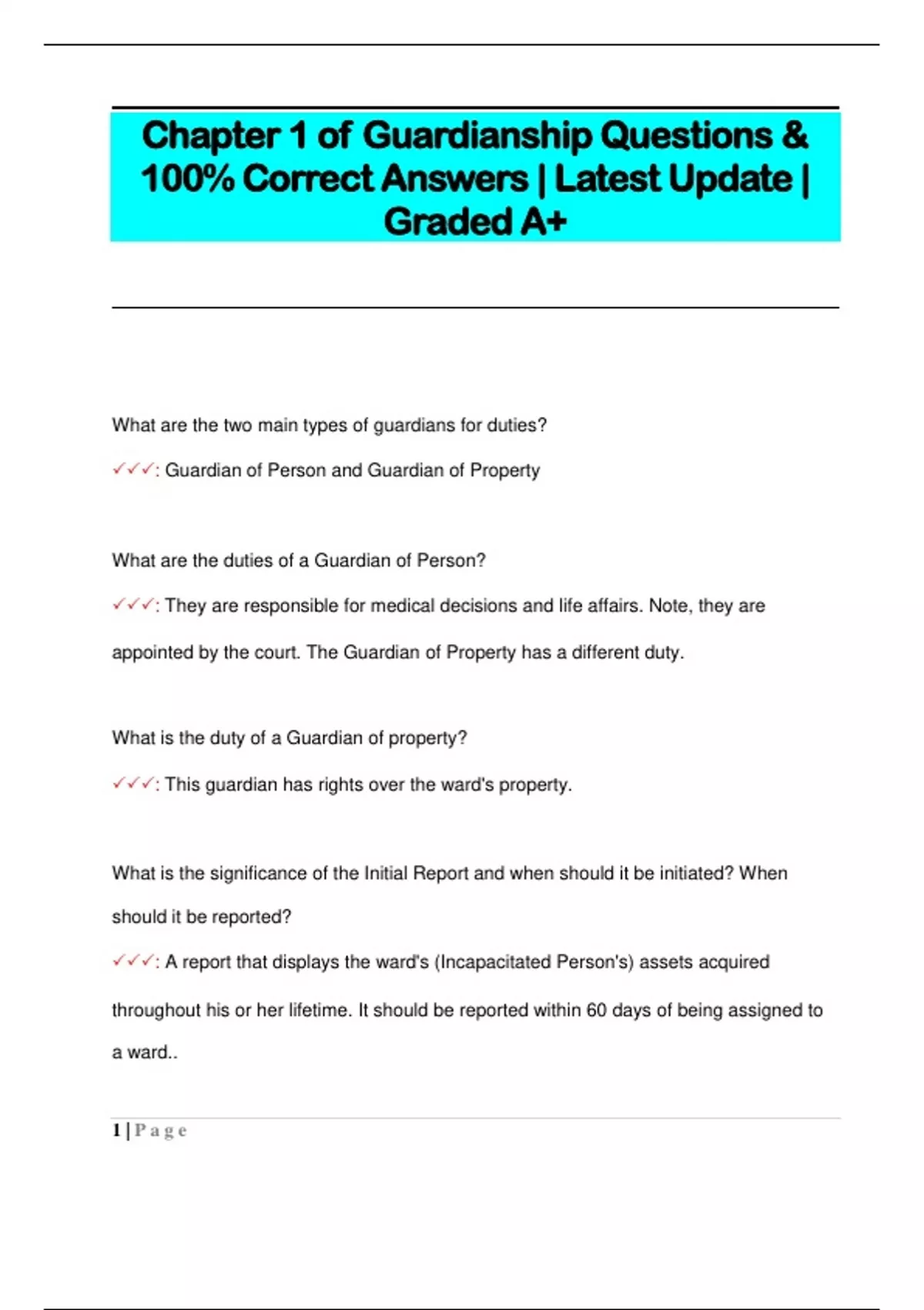 Chapter 1 of Guardianship Questions & 100% Correct Answers | Latest Update | Graded A+