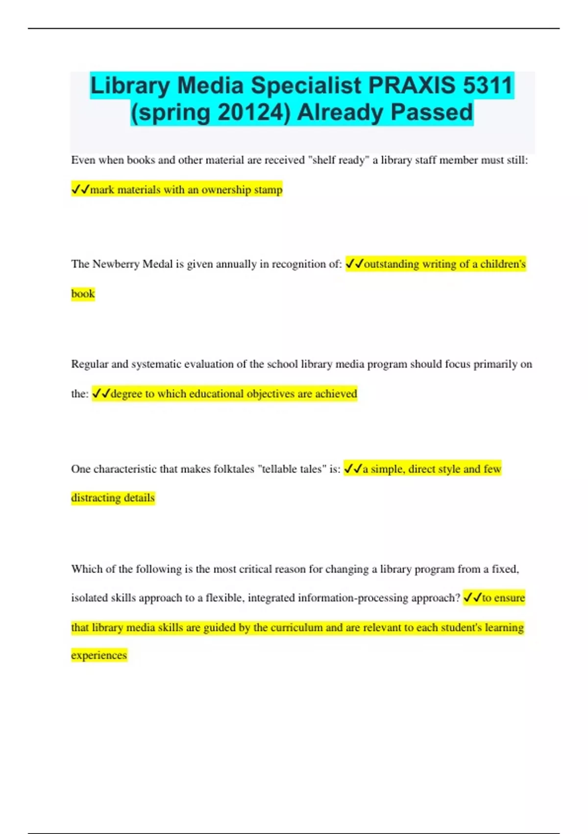 Praxis 0311/5311 LMS Practice Quiz 2 - Library Media Specialist Questions and Answers 100% Pass A library media specialist wants to ensure that library and research skills are taught as an integral part of the curriculum. Which of the following activities best promotes this objective? A. Design library media center facilities that are conducive to both small- and large-group instruction. B. Maintain close cooperation with faculty concerning the implementation of the instructional program. C. Provide professional in-service training workshops for faculty in the library media center. D. Create a comprehensive collection of cross-curricular holdings that support various learning levels. B A student wants to use music downloaded from the Internet in connection with a classroom multimedia presentation. In order to ensure compliance with federal copyright law and the Fair Use Guidelines for Educational Multimedia, a school library media specialist should: A. allow the student to incorporate the music into a single-use school presentation and keep a student portfolio copy. B. allow the student to copy the music onto a floppy disk and return it to the library to be erased after a single use. C. suggest that a teacher run the presentation directly off the computer so that a copy of the music will not be needed. D. offer to obtain a compact disc of the music via interlibrary loan and return the compact disc after only a single use. A While examining various Web sites relevant to her research topic, a student observes that the sites offer divergent points of view. What should be the library media specialist's response to this observation? A. Explain that opinions vary from person to person and this divergence should be expected. B. Suggest that the student check the sources of the Web sites to determine if any organizational connections exist. C. Suggest that the student seek print resources that tend to be more
