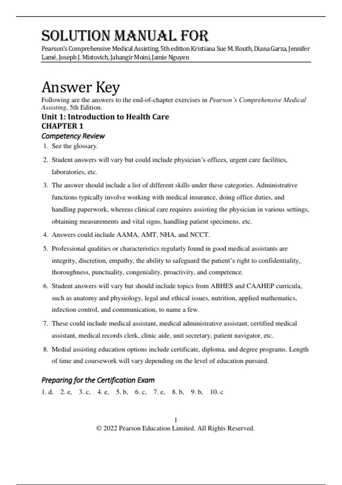 Solution Manual For Pearson's Comprehensive Medical Assisting, 5th Edition by Kristiana Sue M. Routh, Diana Garza, Jennifer Lamé, Joseph J. Mistovich, Jahangir Moini, Jamie Nguyen