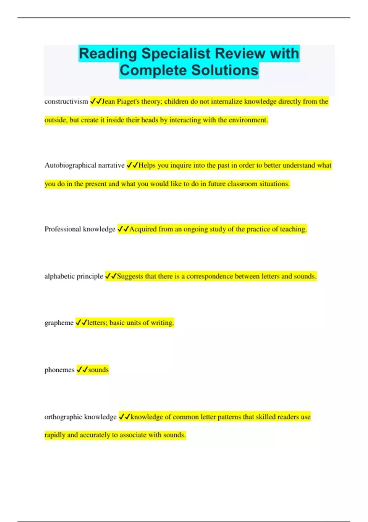 reading specialist review with complete solutions