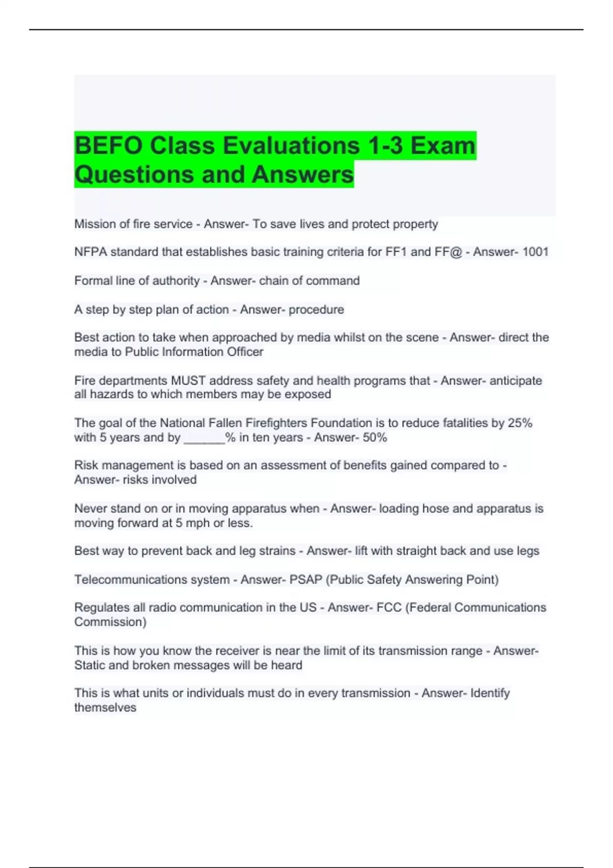 BEFO Class Evaluations 1-3 Exam Questions and Answers 2024