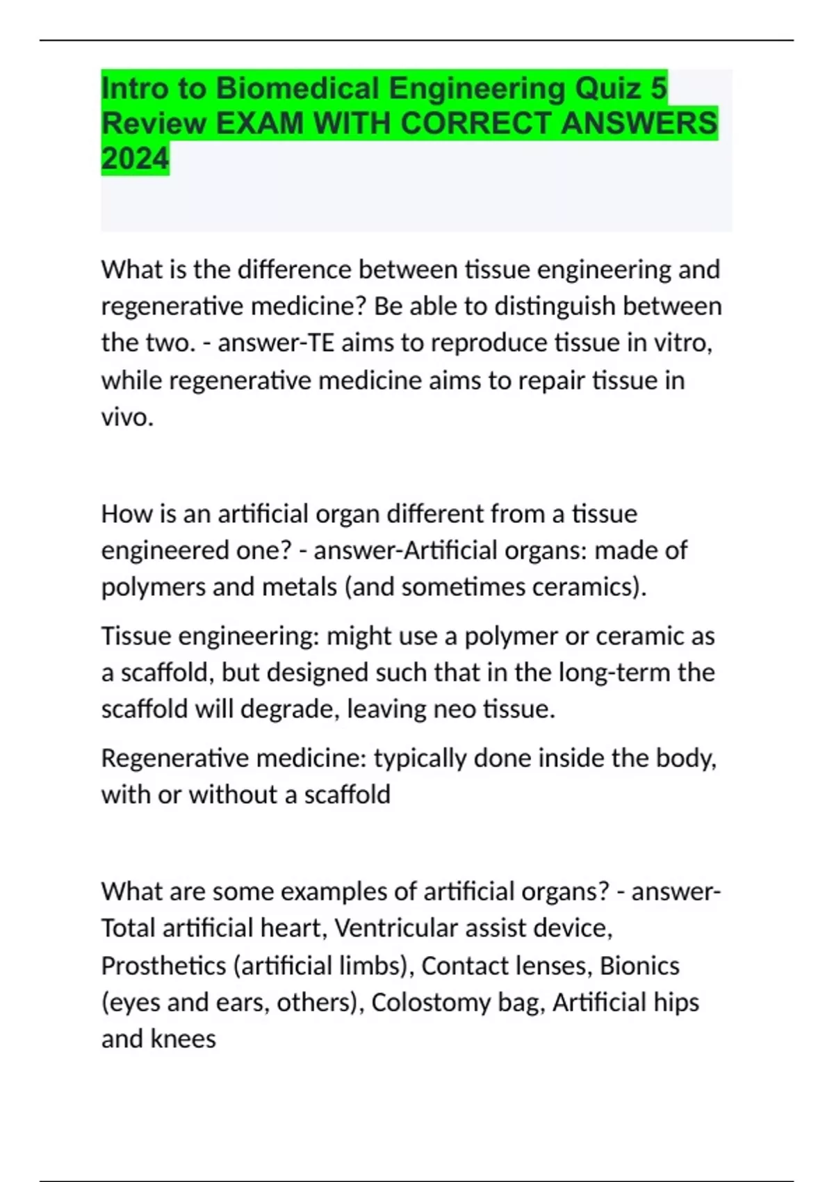 What is the difference between tissue engineering and regenerative medicine? Be able to distinguish between the two. - answer-TE aims to reproduce tissue in vitro, while regenerative medicine aims to repair tissue in vivo. How is an artificial organ different from a tissue engineered one? - answer-Artificial organs: made of polymers and metals (and sometimes ceramics). Tissue engineering: might use a polymer or ceramic as a scaffold, but designed such that in the long-term the scaffold will degrade, leaving neo tissue. Regenerative medicine: typically done inside the body, with or without a scaffold What are some examples of artificial organs? - answer-Total artificial heart, Ventricular assist device, Prosthetics (artificial limbs), Contact lenses, Bionics (eyes and ears, others), Colostomy bag, Artificial hips and knees What are some tissues/organs/structures in the human body that can regenerate themselves? - answer-Skin has limited ability to regenerate, the liver can regenerate if only 25% of it remains. The human lens can also regenerate. What is the motivation for tissue engineering (i.e., why so much interest?)? - answer-Many organs do not repair/regenerate themselves. Transplant demand is much higher than transplant supply When was the first official tissue engineering approach carried out? - answer-1970s by W.T. Green, placed cartilage cells (chondrocytes) on bone spicules (small chunks) to try to regrow cartilage. What is a nude mouse? - answer-a laboratory mouse from a strain with a genetic mutation that causes a deteriorated or absent thymus, resulting in an inhibited immune system due to a greatly reduced number of T cells. What was the "auriculosaurus"? - answer-A lab mouse with an ear on its back. What is a tissue engineering scaffold and why is it needed? - answer-Act as templates for tissue regeneration, to guide the growth of new tissue. What are three materials for scaffolds that have been used to try to regenerate tissue? - answer-PLGA (suture material), Alginates (isolated from seaweed, used in wound dressings), Fibrin ("fibrin glue"), Chitosan Collagen/glycosaminoglycans(naturally occurring), Hydrogels based on polyethylene glycol (PEG) What are three different techniques used to create tissue engineering scaffolds? - answer-Gas foaming, emulsification, freeze-drying, 3D bioprinting. Why are stem cells important for regenerative medicine/tissue engineering? - answer-Because they are grown easily in the laboratory and appear to be capable of becoming any type of cell. What is a stem cell? Where are they isolated from? What are the differences between embryonic and adult stem cells? Where can adult stem cells be found? - answer-An unspecialized cell that can renew itself indefinitely and develop into more mature, specialized cell. Adult stem cells can be found in hematopoietic stem cells, neuronal stem cells mesenchymalstem cells (also found in bone marrow), epithelial stem cells, skin stem cells. What are the differences between totipotent, pluripotent, and multipotent? - answer-totipotent, meaning that its potential is total. pluripotent— they can give rise to many types of cells but not all types of cells necessary for fetal development. From where are embryonic stem cells isolated? - answer-stem cells that come from embryos that are three to five days old. Which stem cells give rise to: red blood cells? Cartilage cells? Nerve cells? Epidermal cells? - answer-Hematopoietic Stem Cells = red blood cells. Mesenchymalstem cells = cartilage cells. Neural Stem Cells = nerve cells. Skin Stem Cells = epidermal cells. What are the two main types of cells found in skin? - answer-Epidermal cells and follicular cells What is cell expansion? - answer-In order for stem cells, or even fully differentiated cell populations to be truly beneficial or useful, either therapeutically, as drug screening tools, or for core research purposes, expansion of cells is prerequisite. What are two tissue engineering products that the FDA has approved to date? - answer-Apligraf and carticel What was the first FDA approved tissue engineering scaffold/product and when approved? - answer-Integra -artificial skin composed of silicone and collagen/glycosaminoglycans, FDA approved in 1996. What is Apligraf composed of? - answer-collagen matrix with fibroblasts and keratinocytes and 40 bioactive factors. When was MACI FDA approved? - answer-FDA approved in December of 2016. What is the difference between ACI (aka Carticel) and MACI (aka Vericel)? - answer-matrix-induced autologous cartilage implant Why did Vericel close its EU manufacturing site? - answer-Wasn't economical/profitable (poor sales), mainly because of Europe's cash-strapped health care system (reimbursement issues). What is the single biggest challenge to tissue engineering? - answer-vascularization When did the U.S. essentially begin to start regulating drugs? - answer-1906 When did the U.S. start regulating medical devices? - answer-1976 What are the main differences between Class I, Class II, and Class III devices. - answer-Class 1 devices pose the least amount of risk to consumers. These low-risk devices, such as oxygen masks or surgical tools, are subject to "general controls." Class 2 devices pose more risk to consumers than do Class 1 devices. Therefore, Class 2 devices are subject to special controls in addition to general controls. Class 3 devices support or sustain life, are implanted in the body, or have the potential for unreasonable risk of illness or injury. Examples include pacemakers, breast implants, and HIV diagnostic tests. As a result, Class 3 devices require premarket approval. What does it mean by the "510(k)" pathway? - answer-Requires proof that the devices is substantially equivalent (SE) to a legally marketed device that is not subject to Premarket Approval (PMA). Does the FDA "approve" Class II devices? - answer-Yes, if it is not proven that the device is substantially equivalent to another device already on t