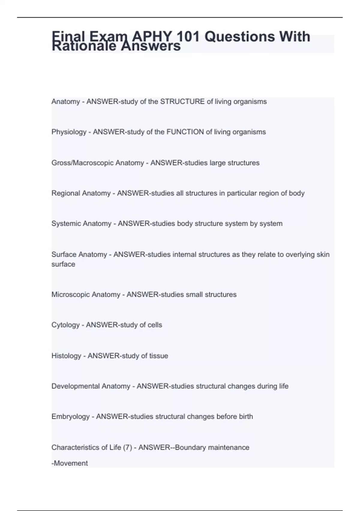 Physiology - ANSWER-study of the FUNCTION of living organisms Gross/Macroscopic Anatomy - ANSWER-studies large structures Regional Anatomy - ANSWER-studies all structures in particular region of body Systemic Anatomy - ANSWER-studies body structure system by system Surface Anatomy - ANSWER-studies internal structures as they relate to overlying skin surface Microscopic Anatomy - ANSWER-studies small structures Cytology - ANSWER-study of cells Histology - ANSWER-study of tissue Developmental Anatomy - ANSWER-studies structural changes during life Embryology - ANSWER-studies structural changes before birth
