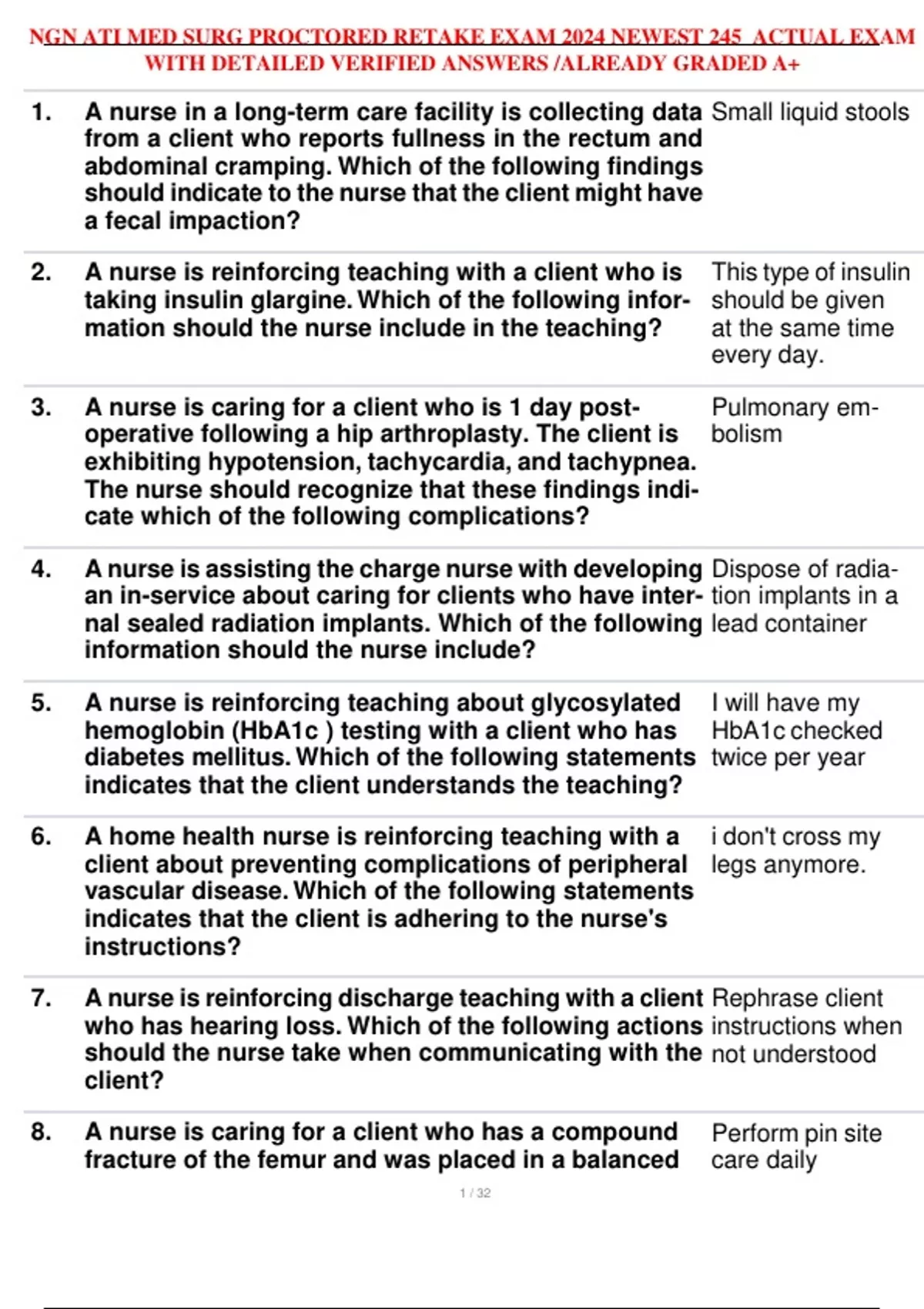 NGN ATI MED SURG PROCTORED RETAKE EXAM 2024 NEWEST 245 ACTUAL EXAM WITH DETAILED VERIFIED ANSWERS /ALREADY GRADED A+