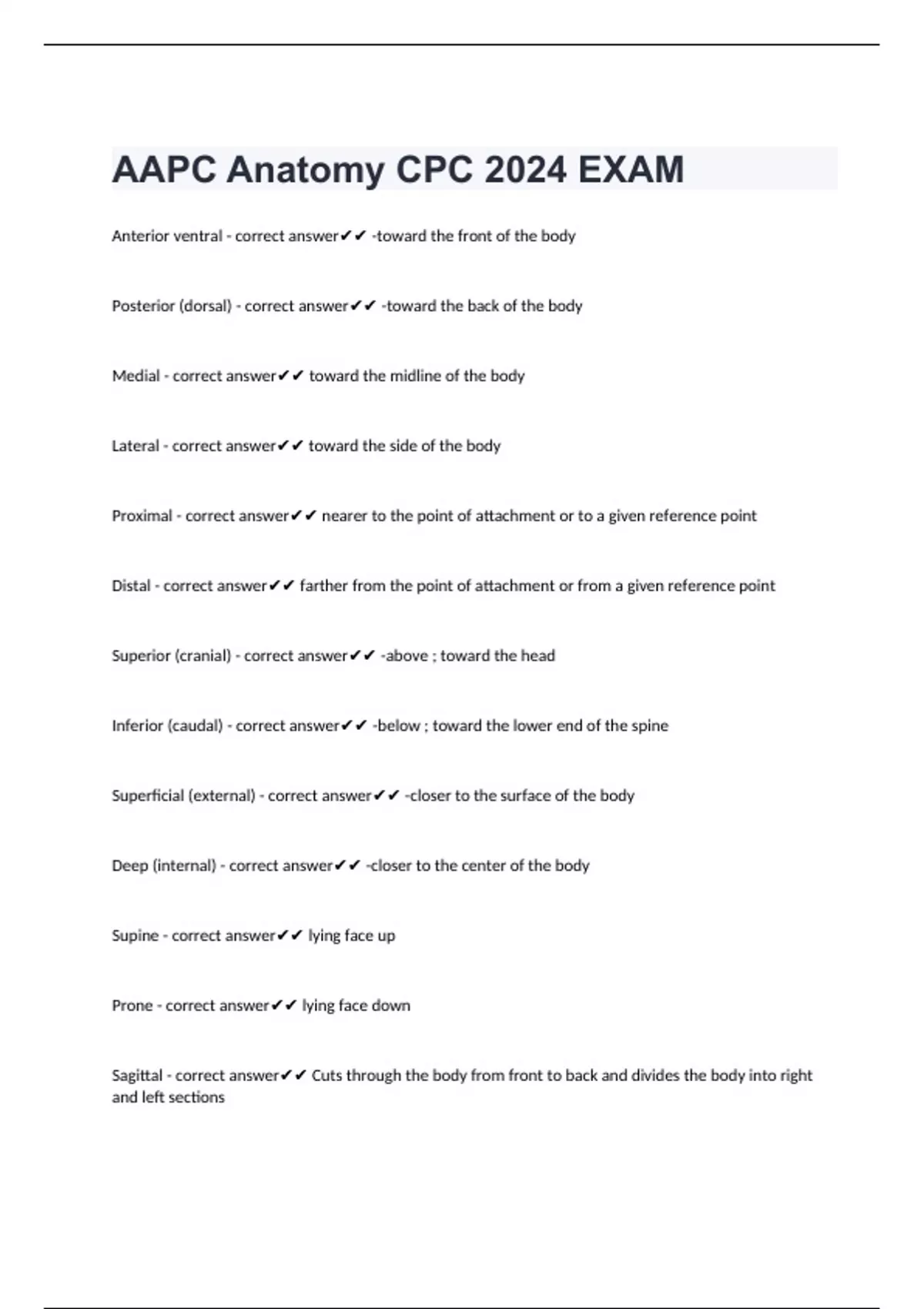 AAPC Anatomy CPC 2024 EXAM Anterior ventral - correct answer -toward the front of the body Posterior (dorsal) - correct answer -toward the back of the body Medial - correct answer toward the midline of the body Lateral - correct answer toward the side of the body Proximal - correct answer nearer to the point of attachment or to a given reference point Distal - correct answer farther from the point of attachment or from a given reference point Superior (cranial) - correct answer -above ; toward the head Inferior (caudal) - correct answer -below ; toward the lower end of the spine Superficial (external) - correct answer -closer to the surface of the body Deep (internal) - correct answer -closer to the center of the body Supine - correct answer lying face up Prone - correct answer lying face down
