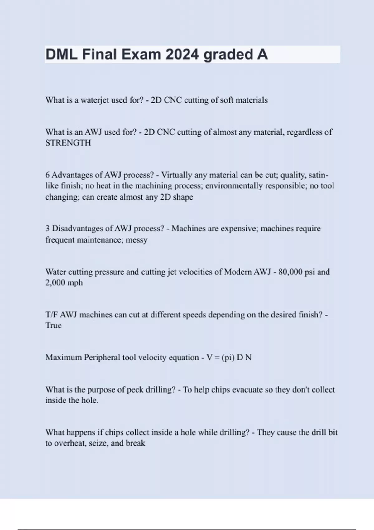 What is a waterjet used for? - 2D CNC cutting of soft materials What is an AWJ used for? - 2D CNC cutting of almost any material, regardless of STRENGTH 6 Advantages of AWJ process? - Virtually any material can be cut; quality, satin-like finish; no heat in the machining process; environmentally responsible; no tool changing; can create almost any 2D shape 3 Disadvantages of AWJ process? - Machines are expensive; machines require frequent maintenance; messy Water cutting pressure and cutting jet velocities of Modern AWJ - 80,000 psi and 2,000 mph T/F AWJ machines can cut at different speeds depending on the desired finish? - True Maximum Peripheral tool velocity equation - V = (pi) D N What is the purpose of peck drilling? - To help chips evacuate so they don't collect inside the hole. What happens if chips collect inside a hole while drilling? - They cause the drill bit to overheat, seize, and break What is the limiting factor for how deep to cut (per pass) with an endmill in a particular material - Cutting tool / workpiece / machine stiffness What is the limiting factor for how fast a drill or endmill can rotate in a particular material? - Head generated in the cutting zone What is the limiting factor for how fast a drill or endmill can feed thru any material? - Size / strength of cutting edges / lips What are six factors that affect optimum cutting speed for drilling and milling? - Strength and thermal conductivity of material Depth of hole Presence and efficiency of cutting fluid Type, condition and stiffness of cutting machine Stiffness of workpiece, fixture and tooling Quality of holes desired When should you use slower cutting speeds? - Roughing cuts Stronger materials Flexible workpieces When trying to maximize tool life Sheet metal - Workpieces with a high ratio of surface area to thickness Sheets - <= 1/4" in thickness Plates - > 1/4" in thickness T/F Pulling, pushing, and stretching are the most common sheet metal operations - False What sheet metal capabilities does the lab have? - Shear, brake (bending) , punch press (round holes) What is the structural benefit of bending sheet metal edges and flanges - The sheet metal becomes stronger/stiffer