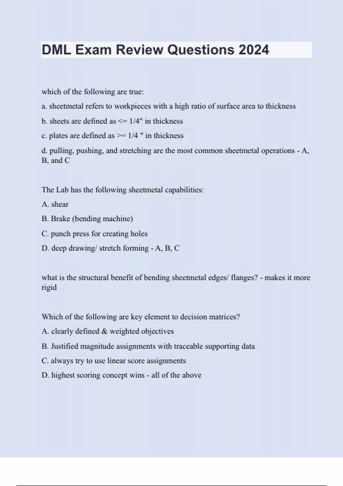 which of the following are true: a. sheetmetal refers to workpieces with a high ratio of surface area to thickness b. sheets are defined as <= 1/4" in thickness c. plates are defined as >= 1/4 " in thickness d. pulling, pushing, and stretching are the most common sheetmetal operations - A, B, and C The Lab has the following sheetmetal capabilities: A. shear B. Brake (bending machine) C. punch press for creating holes D. deep drawing/ stretch forming - A, B, C what is the structural benefit of bending sheetmetal edges/ flanges? - makes it more rigid Which of the following are key element to decision matrices? A. clearly defined & weighted objectives B. Justified magnitude assignments with traceable supporting data C. always try to use linear score assignments D. highest scoring concept wins - all of the above why are separate evaluation matrices created for separate functional subunits of a design? - pick the best subunits because we can combine them T/ F manufacturing time is an example of a qualitative assessment? - False What are (4) the things that can cause calipers to measure inaccurately? - failure to zero the calipers before use debris, chips, or burrs failure to hold the jaws perpendicular to the surface inadequate or excessive closing pressure T/ F Your group must have a fully dimensioned, appropriately toleranced part drawing for each part manufactured in the lab - TRUE T/ F If anyone in your group doesn't understand how each part of your design works, that person will be instructed to stop working until they do - TRUE What should do if anyone in your group makes excuses for not completing their work on time or at an acceptable quality: A. accept effort, not excuses and isntrcut the person to redo the assignment B. make a record of tehir work quality or tardiness on your meeting documentation C. if the problem isnt resolved within 48 hr., get Mike involved because youre here to learn D. wait to confront the problem in hopes that doing so may avoid conflict - A, B, C T/ F Purchase orders must be submitted next week before using ANY raw materials in the lab - TRUE T/ F ECN's are used to formally track design changes and corrections through the project prototyping and life- cycle phase - TRUE Groups which care about their success on the course project will read the Project Tips posted on the website and do which of the following: A. review their weekly schedule and plan their individual work assignments B. review part drawings in office hours with a TA to be prepared to make the parts in lab C. complete paperwork outside their formal lab block D. print working copies of non- OTS part drawings for reference during lab E. use 80/20 wisely by selecting pre- cut pieces before cutting longer pieces to length; and only cutting the shortest over-size pieces to the necessary lengths F. bring 1:1 scale printed and trimmed sheetmetal templates to lab to expedite part fabrication