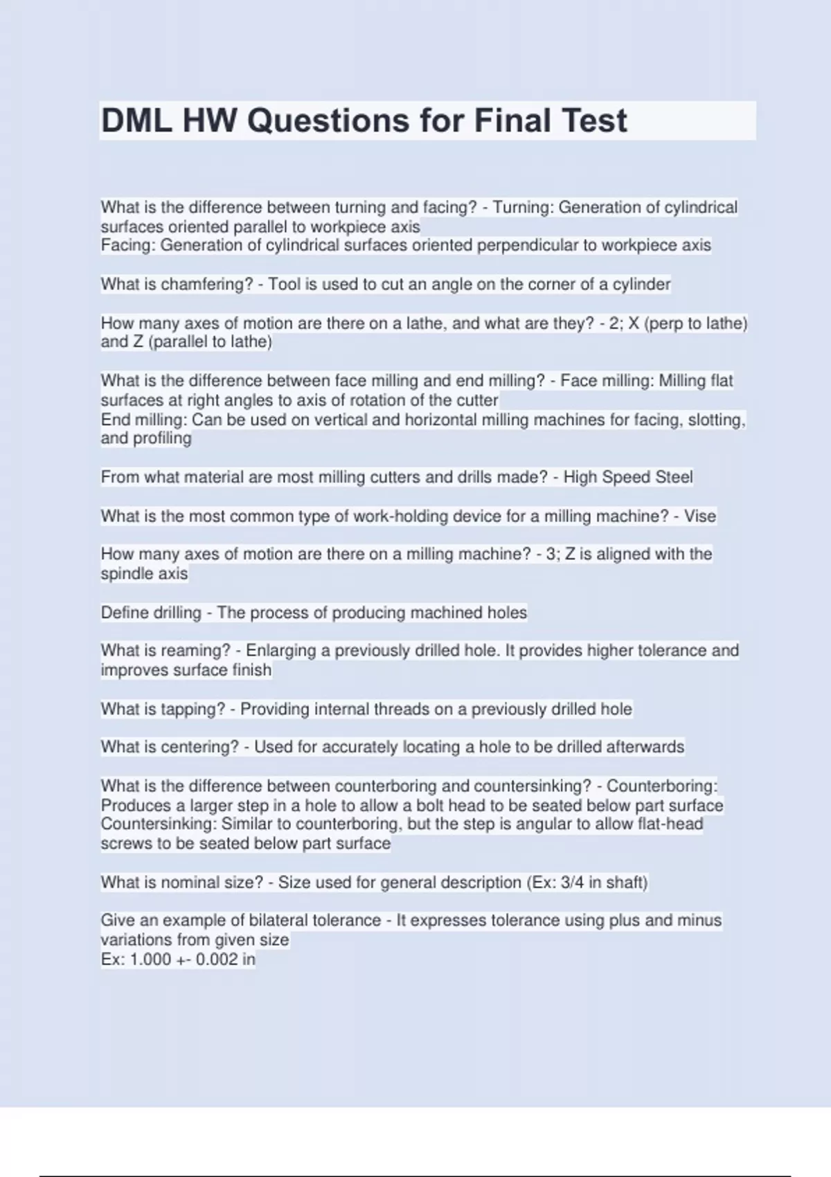 What is the difference between turning and facing? - Turning: Generation of cylindrical surfaces oriented parallel to workpiece axis Facing: Generation of cylindrical surfaces oriented perpendicular to workpiece axis What is chamfering? - Tool is used to cut an angle on the corner of a cylinder How many axes of motion are there on a lathe, and what are they? - 2; X (perp to lathe) and Z (parallel to lathe) What is the difference between face milling and end milling? - Face milling: Milling flat surfaces at right angles to axis of rotation of the cutter End milling: Can be used on vertical and horizontal milling machines for facing, slotting, and profiling From what material are most milling cutters and drills made? - High Speed Steel What is the most common type of work-holding device for a milling machine? - Vise How many axes of motion are there on a milling machine? - 3; Z is aligned with the spindle axis Define drilling - The process of producing machined holes What is reaming? - Enlarging a previously drilled hole. It provides higher tolerance and improves surface finish What is tapping? - Providing internal threads on a previously drilled hole What is centering? - Used for accurately locating a hole to be drilled afterwards What is the difference between counterboring and countersinking? - Counterboring: Produces a larger step in a hole to allow a bolt head to be seated below part surface Countersinking: Similar to counterboring, but the step is angular to allow flat-head screws to be seated below part surface What is nominal size? - Size used for general description (Ex: 3/4 in shaft) Give an example of bilateral tolerance - It expresses tolerance using plus and minus variations from given size Ex: 1.000 +- 0.002 in Give and example of a limit dimension - Gives upper and lower permitted sizes for a single feature Ex: .998-1.002 What is a clearance fit? - A fit in which one part easily fits into another with a resulting clearance gap Tolerance = (smallest hole)-(biggest shaft) What is an interference fit? - A fit in which one part must be forcibly fitted into another What are 10 things that are essential to every detail drawing? - 1. Dimensions necessary to locate every feature on the part 2. Tolerances for every dimension on the drawing 3. Unit specification 4. Material specification 5. Quantity of parts to be made 6. Surface finish specifications for every surface 7. Appropriate hole and thread notes 8. Unique part name and part number 9. Names of designer and drawer 10. Additional notes about breaking sharp corners, etc. What is the difference between accuracy and precision? - Accuracy: How close a measured value is to the actual value Precision: How close the measured values are to each other What 4 things should every BOM include? - 1. Part numbers 2. Part quantities 3. Part descriptions 4. Unique item numbers that match the corresponding balloons on the drawing Fill in the following unit conversions: 1 inch = ____ mm 1 mm = ____ in 1 m = ____ ft 1 lb = ____ N 1 kg = ____ lb - 1 inch = 25.4 mm 1 mm = 0.0394 in 1 m = 3.28 ft 1 lb = 4.45 N 1 kg = 2.2 lb What is the functional difference between a bolt and a screw? - Bolts have external threads that accept a non-tapered nut Screws have external threads that are threaded into the material they will hold (do not mate with a nut) Regardless of country of origin, what are the two varieties of fastener threads available? - Coarse and fine How are threads on all quality fasteners made and why are they made this way? - They have rolled threads. Rolled threads produce superior surface finish and improved material properties from cold working the material. Rolled threads result in higher fatigue resistance