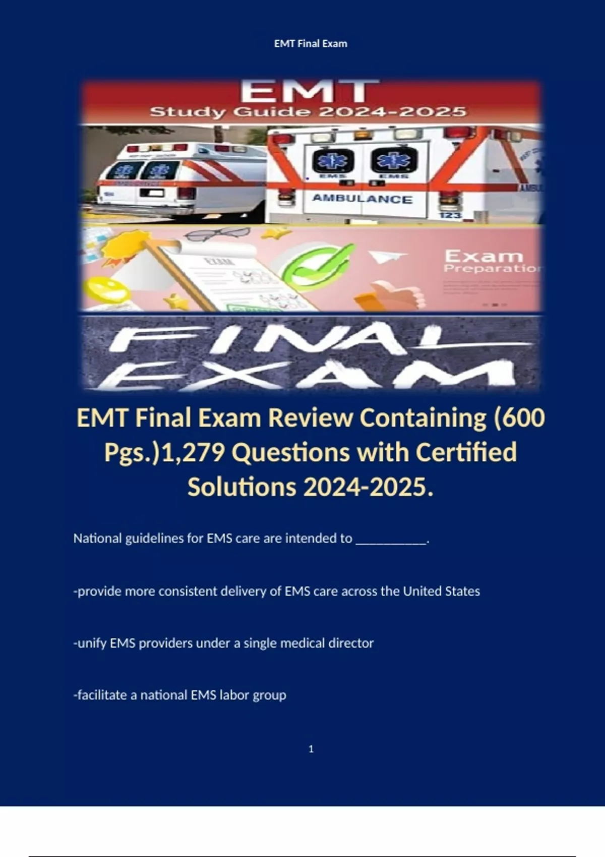 EMT Final Exam Review Containing (600 Pgs.)1,279 Questions with Certified Solutions . Terms like: National guidelines for EMS care are intended to __________.ANS: Provide more consistent delivery of EMS care across the United States