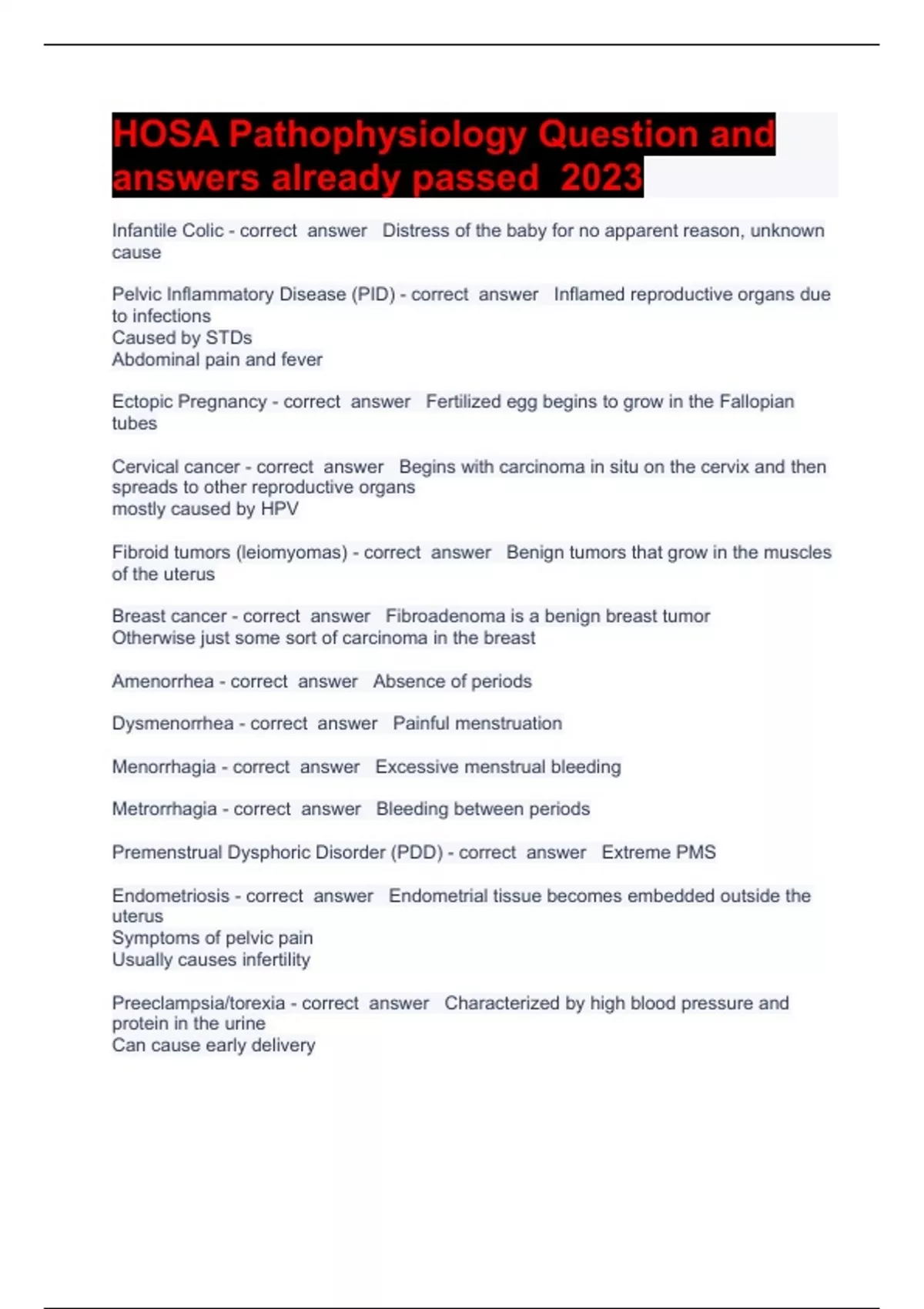HOSA Pathophysiology Question and answers already passed 2023(updated )HOSA Pathophysiology Question and answers already passed 2023 Infantile Colic - correct answer Distress of the baby for no apparent reason, unknown cause Pelvic Inflammatory Disease (PID) - correct answer Inflamed reproductive organs due to infections Caused by STDs Abdominal pain and fever Ectopic Pregnancy - correct answer Fertilized egg begins to grow in the Fallopian tubes Cervical cancer - correct answer Begins with carcinoma in situ on the cervix and then spreads to other reproductive organs mostly caused by HPV Fibroid tumors (leiomyomas) - correct answer Benign tumors that grow in the muscles of the uterus Breast cancer - correct answer Fibroadenoma is a benign breast tumor Otherwise just some sort of carcinoma in the breast Amenorrhea - correct answer Absence of periods Dysmenorrhea - correct answer Painful menstruation Menorrhagia - correct answer Excessive menstrual bleeding Metrorrhagia - correct answer Bleeding between periods Premenstrual Dysphoric Disorder (PDD) - correct answer Extreme PMS Endometriosis - correct answer Endometrial tissue becomes embedded outside the uterus