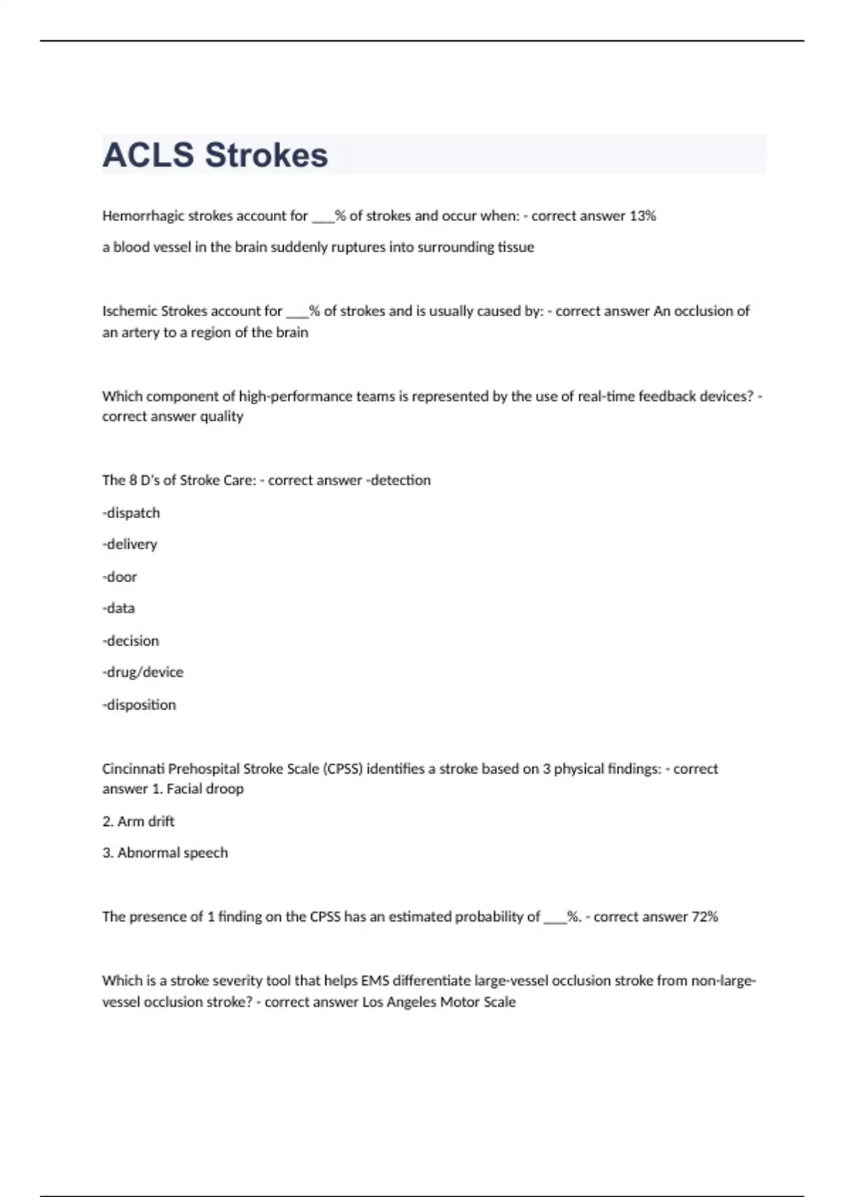 ACLS Strokes Final Exam Questions 2024.Hemorrhagic strokes account for ___% of strokes and occur when: - correct answer 13% a blood vessel in the brain suddenly ruptures into surrounding tissue Ischemic Strokes account for ___% of strokes and is usually caused by: - correct answer An occlusion of an artery to a region of the brain Which component of high-performance teams is represented by the use of real-time feedback devices? - correct answer quality The 8 D's of Stroke Care: - correct answer -detection -dispatch -delivery -door -data -decision -drug/device -disposition Cincinnati Prehospital Stroke Scale (CPSS) identifies a stroke based on 3 physical findings: - correct answer 1. Facial droop 2. Arm drift 3. Abnormal speech The presence of 1 finding on the CPSS has an estimated probability of ___%. - correct answer 72% Which is a stroke severity tool that helps EMS differentiate large-vessel occlusion stroke from non-large-vessel occlusion stroke? - correct answer Los Angeles Motor Scale
