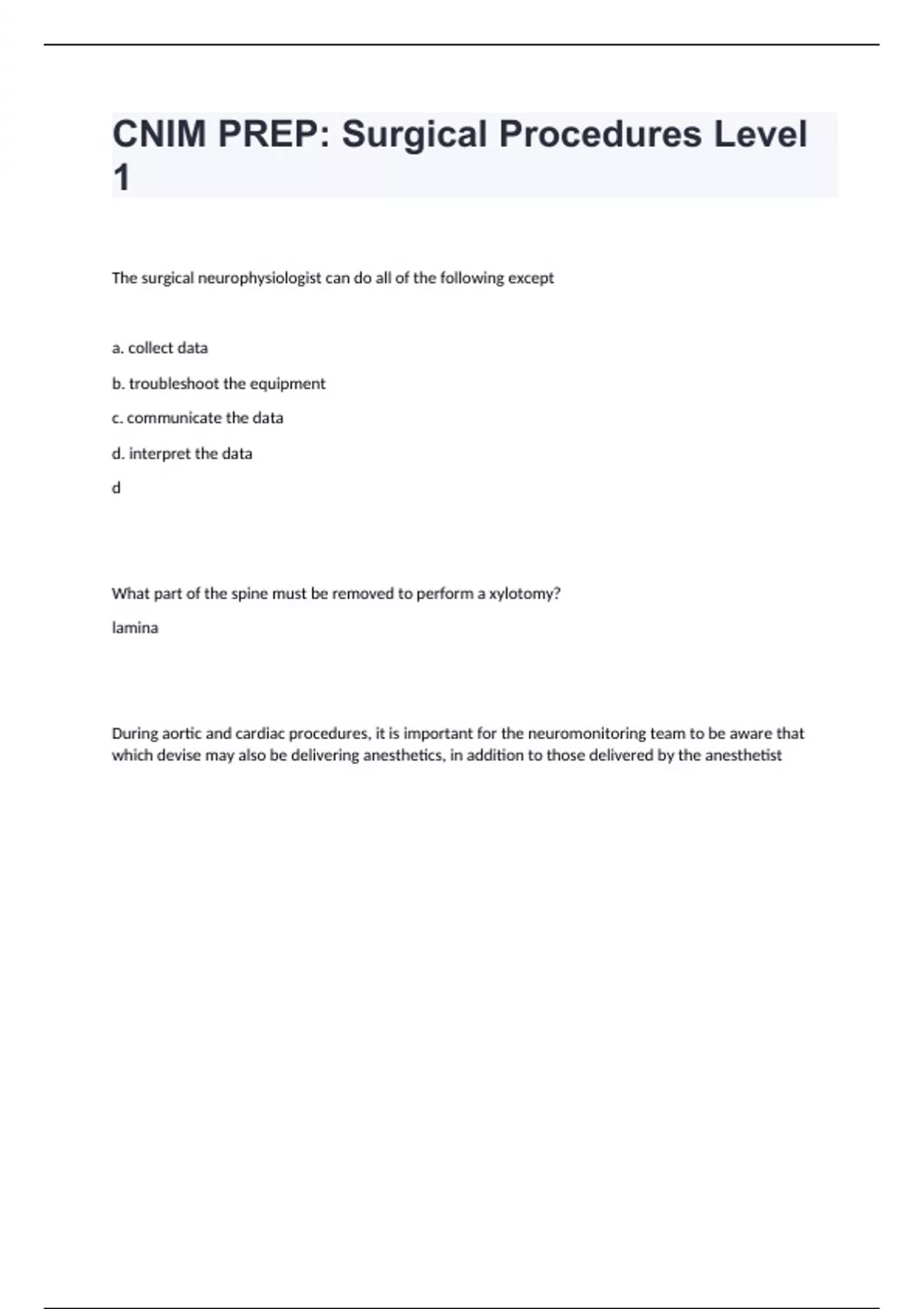 CNIM PREP Surgical Procedures Level 1 Question and answers correctly solved 2024CNIM PREP: Surgical Procedures Level 1 The surgical neurophysiologist can do all of the following except a. collect data b. troubleshoot the equipment c. communicate the data d. interpret the data d What part of the spine must be removed to perform a xylotomy? lamina During aortic and cardiac procedures, it is important for the neuromonitoring team to be aware that which devise may al