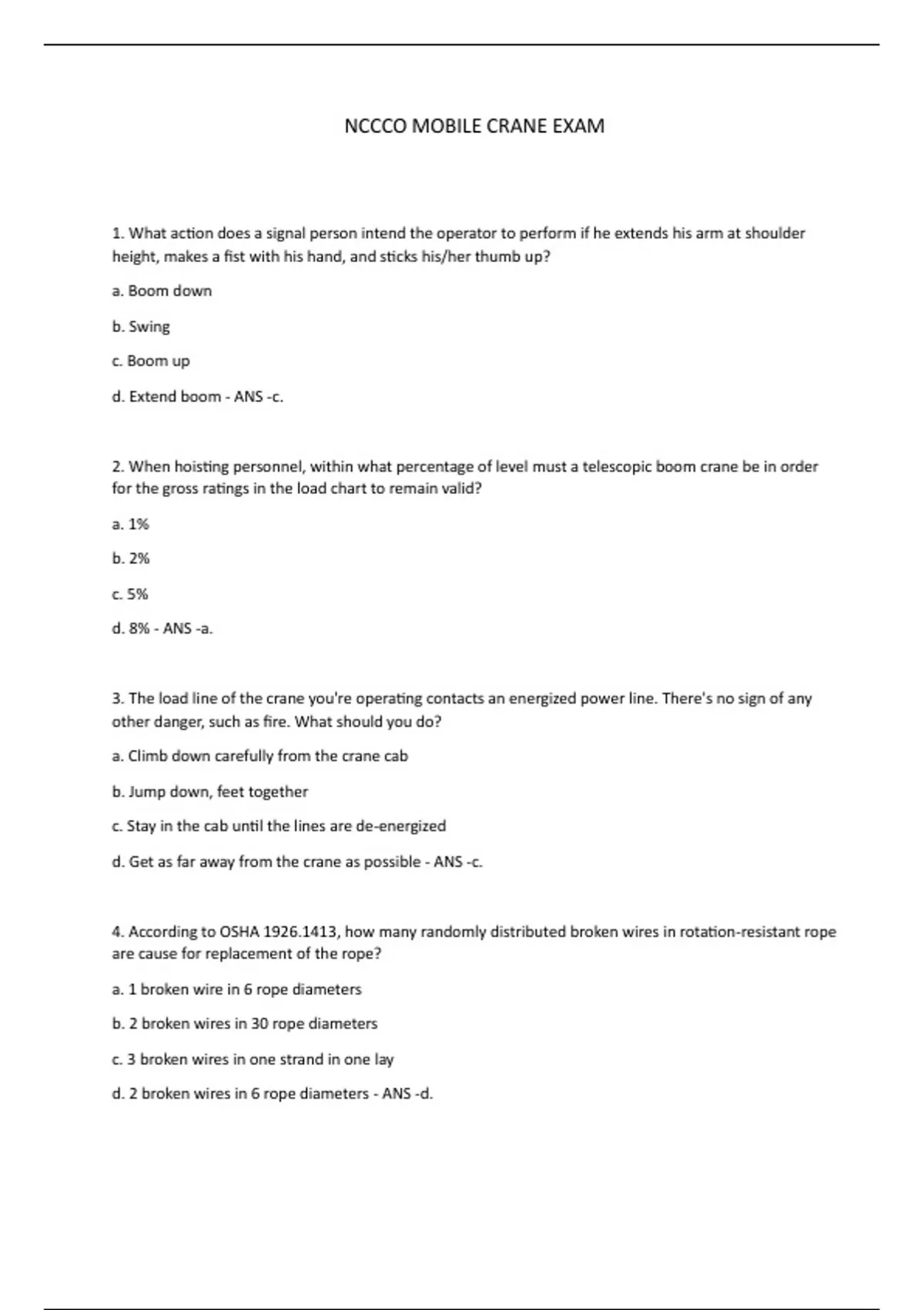NCCCO MOBILE CRANE EXAM 1. What action does a signal person intend the operator to perform if he extends his arm at shoulder height, makes a fist with his hand, and sticks his/her thumb up? a. Boom down b. Swing c. Boom up d. Extend boom - ANS -c. 2. When hoisting personnel, within what percentage of level must a telescopic boom crane be in order for the gross ratings in the load chart to remain valid? a. 1% b. 2% c. 5% d. 8% - ANS -a. 3. The load line of the crane you're operating contacts an energized power line. There's no sign of any other danger, such as fire. What should you do? a. Climb down carefully from the crane cab b. Jump down, feet together c. Stay in the cab until the lines are de-energized d. Get as far away from the crane as possible - ANS -c. 4. According to OSHA 1926.1413, how many randomly distributed broken wires in rotation-resistant rope are cause for replacement of the rope? a. 1 broken wire in 6 rope diameters b. 2 broken wires in 30 rope diameters c. 3 broken wires in one strand in one lay d. 2 broken wires in 6 rope diameters - ANS -d. 5. What is the net capacity of a crane on main boom unless the manufacturer states otherwise? a. The capacity listed in the load chart minus the weight of the rigging and all attachments b. The capacity listed in the load chart plus the weight of the rigging and all attachments c. The capacity listed in the load chart minus the weight of the rigging and all attachments not in use d. The capacity listed in the load chart minus the weight of the rigging alone - ANS -a.