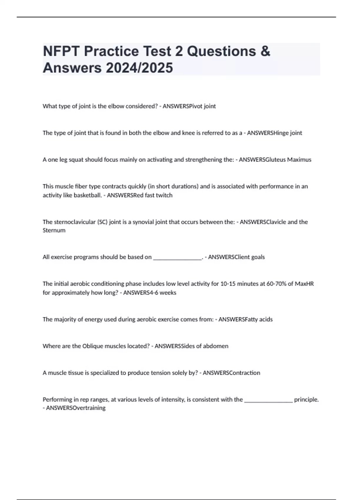 NFPT Practice Test 2 Questions & Answers 2024/2025 What type of joint is the elbow considered? - ANSWERSPivot joint The type of joint that is found in both the elbow and knee is referred to as a - ANSWERSHinge joint A one leg squat should focus mainly on activating and strengthening the: - ANSWERSGluteus Maximus This muscle fiber type contracts quickly (in short durations) and is associated with performance in an activity like basketball. - ANSWERSRed fast twitch The sternoclavicular (SC) joint is a synovial joint that occurs between the: - ANSWERSClavicle and the Sternum All exercise programs should be based on _______________. - ANSWERSClient goals The initial aerobic conditioning phase includes low level activity for 10-15 minutes at 60-70% of MaxHR for approximately how long? - ANSWERS4-6 weeks The majority of energy used during aerobic exercise comes from: - ANSWERSFatty acids Where are the Oblique muscles located? - ANSWERSSides of abdomen A muscle tissue is specialized to produce tension solely by? - ANSWERSContraction Performing in rep ranges, at various levels of intensity, is consistent with the _______________ principle. - ANSWERSOvertraining