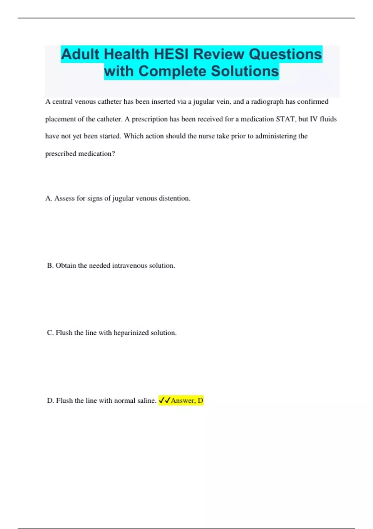 A central venous catheter has been inserted via a jugular vein, and a radiograph has confirmed placement of the catheter. A prescription has been received for a medication STAT, but IV fluids have not yet been started. Which action should the nurse take prior to administering the prescribed medication? A. Assess for signs of jugular venous distention. B. Obtain the needed intravenous solution. C. Flush the line with heparinized solution. D. Flush the line with normal saline. Answer, D