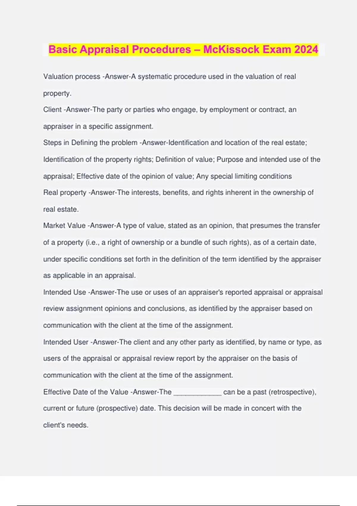 Basic Appraisal Procedures – McKissock Exam 2024 Valuation process -Answer-A systematic procedure used in the valuation of real property. Client -Answer-The party or parties who engage, by employment or contract, an appraiser in a specific assignment. Steps in Defining the problem -Answer-Identification and location of the real estate; Identification of the property rights; Definition of value; Purpose and intended use of the appraisal; Effective date of the opinion of value; Any special limiting conditions Real property -Answer-The interests, benefits, and rights inherent in the ownership of real estate. Market Value -Answer-A type of value, stated as an opinion, that presumes the transfer of a property (i.e., a right of ownership or a bundle of such rights), as of a certain date, under specific conditions set forth in the definition of the term identified by the appraiser as applicable in an appraisal. Intended Use -Answer-The use or uses of an appraiser's reported appraisal or appraisal review assignment opinions and conclusions, as identified by the appraiser based on communication with the client at the time of the assignment. Intended User -Answer-The client and any other party as identified, by name or type, as users of the appraisal or appraisal review report by the appraiser on the basis of communication with the client at the time of the assignment. Effective Date of the Value -Answer-The ____________ can be a past (retrospective), current or future (prospective) date. This decision will be made in concert with the client's needs. Extraordinary assumption -Answer-An assumption, directly related to a specific assignment, as of the effective date of the assignment results, which, if found to be false, could alter the appraiser's opinions or conclusions. Hypothetical Condition -Answer-A condition, directly related to a specific assignment, which is contrary to what is known by the appraiser to exist on the effective date of the assignment results, but is used for the purpose of analysis. Scope of work -Answer-The type and extent of research and analyses in an assignment. Workfile -Answer-Documentation necessary to support an appraiser's analyses, opinions, and conclusions Steps in the Valuation Process -Answer-1. Define the problem 2. Determine scope of work 3. Gather, record, and verify the data 4. Determine the highest and best use 5. Estimate the land value 6. Estimate value by each of the three approaches (if applicable) 7. Reconcile the estimated values into the final opinion of value 8. Report the final opinion of value Highest and Best Use Criteria (in order) -Answer-1. Legally permissible 2. Physically possible. 3. Financially feasible. 4. Maximally productive General data -Answer-Items of information on value influences that derive from social, economic, governmental, and environmental forces and originate outside the property being appraised. Specific data -Answer-Details about the property being appraised, comparable sale and rental properties, and relevant local market characteristics. U.S. Bureau of the Census -Answer-The largest repository of demographics Professional or trade associations offering general data -Answer-National Association of Homebuilders; National Association of Realtors; Appraisal Institute Sources of Specific Data -Answer-Deeds; Location maps; Tax maps; Flood maps; Assessor's records; Title companies; Zoning ordinances; Multiple listing services Special Flood Hazard Area Designation -Answer-FEMA Zones A or V Information in Deed -Answer-The legal description of the property; The owners of record; Easements of record; Deed restrictions; Chain of title (when the property was purchased and from whom) Primary intended user for MLS information -Answer-Agents and Brokers Land -Answer-The earth's surface, both land and water, and anything that is attached to it whether by the course of nature or human hands; all natural resources in their original state, e.g., mineral deposits, wildlife, timber, fish, water, coal deposits, soil. Site -Answer-Land that is improved so that it is ready to be used for a specific purpose. Brownfield -Answer-An industrial or commercial site that is abandoned or underused because it suffers from real or perceived continuing contamination. Site Valuation Methods -Answer-SALES COMPARISON; EXTRACTION; ALLOCATION; SUBDIVISION DEVELOPMENT; LAND RESIDUAL; GROUND RENT CAPITALIZATION Extraction Method -Answer-A method of estimating land value in which the depreciated cost of the improvements on the improved property is estimated and deducted from the total sale price to arrive at an estimated sale price for the land; most effective when the improvements contribute little to the total sale price of the property. Allocation Method -Answer-A method of estimating land value in which sales of improved properties are analyzed to establish a typical ratio of land value to total property value and this ratio is applied to the property being appraised or the comparable sale being analyzed. Principle of Balance -Answer-Real property value is created and sustained when contrasting, opposing, or interacting elements are in a state of equilibrium. Principle of Conformity -Answer-Real property value is created and sustained when the characteristics of a property conform to the demands of its market. Basic income capitalization formula -Answer-Value = Income/Rate Summation Approach -Answer-Another name for cost approach Manufactured Home -Answer-A factory-built house manufactured under the Federal Manufactured Home Construction and Safety Standards Act of 1976