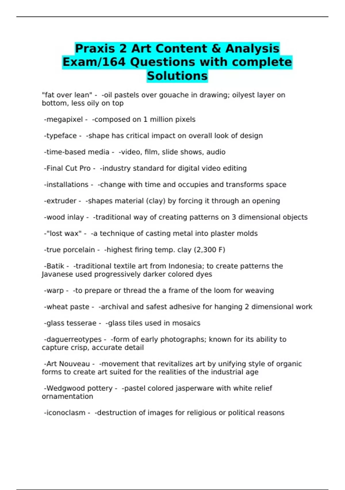Praxis 2 Art Content & Analysis Exam/164 Questions with complete Solutions