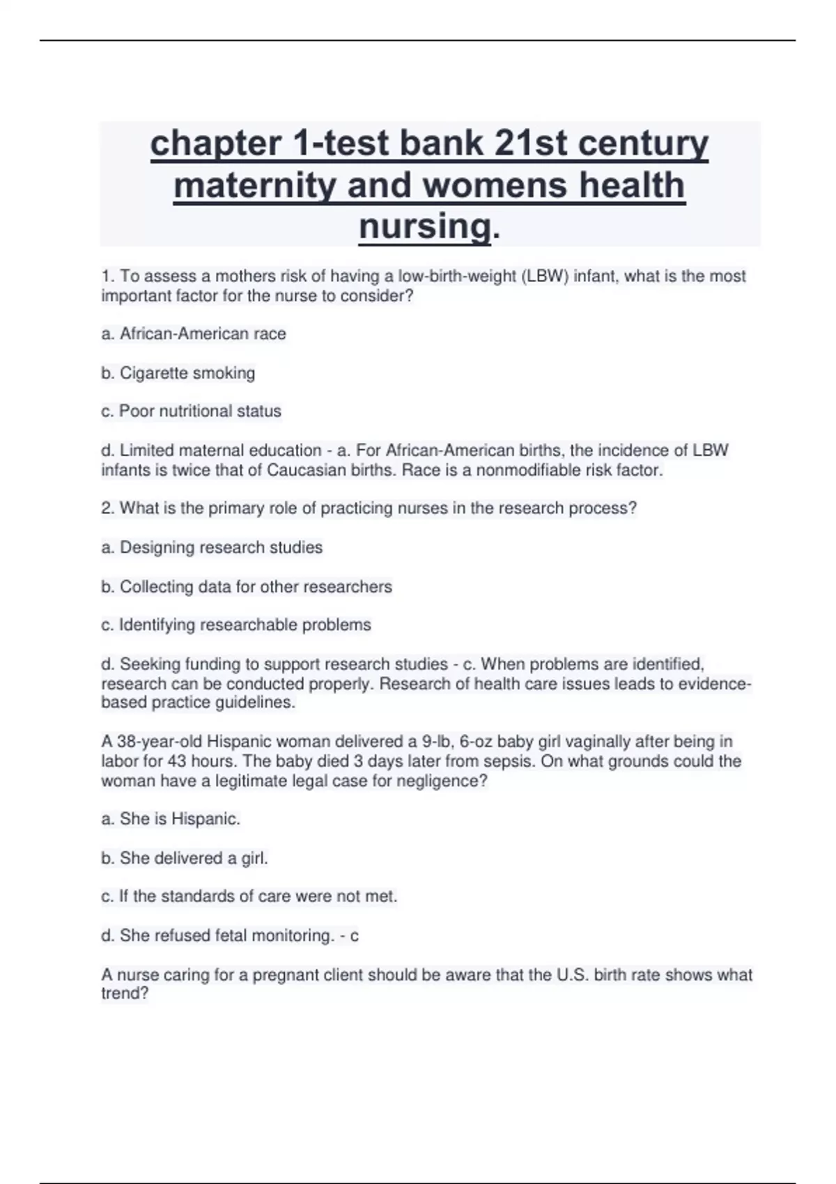 1. To assess a mothers risk of having a low-birth-weight (LBW) infant, what is the most important factor for the nurse to consider? a. African-American race b. Cigarette smoking c. Poor nutritional status d. Limited maternal education - a. For African-American births, the incidence of LBW infants is twice that of Caucasian births. Race is a nonmodifiable risk factor. 2. What is the primary role of practicing nurses in the research process? a. Designing research studies b. Collecting data for other researchers c. Identifying researchable problems d. Seeking funding to support research studies - c. When problems are identified, research can be conducted properly. Research of health care issues leads to evidencebased practice guidelines. A 38-year-old Hispanic woman delivered a 9-lb, 6-oz baby girl vaginally after being in labor for 43 hours. The baby died 3 days later from sepsis. On what grounds could the woman have a legitimate legal case for negligence? a. She is Hispanic. b. She delivered a girl. c. If the standards of care were not met. d. She refused fetal monitoring. - c A nurse caring for a pregnant client should be aware that the U.S. birth rate shows what trend? a. Births to unmarried women are more likely to have less favorable outcomes. b. Birth rates for women 40 to 44 years of age are declining. c. Cigarette smoking among pregnant women continues to increase. d. The rates of pregnancy and abortion among teens are lower in the United States than in any other industrialized country. -