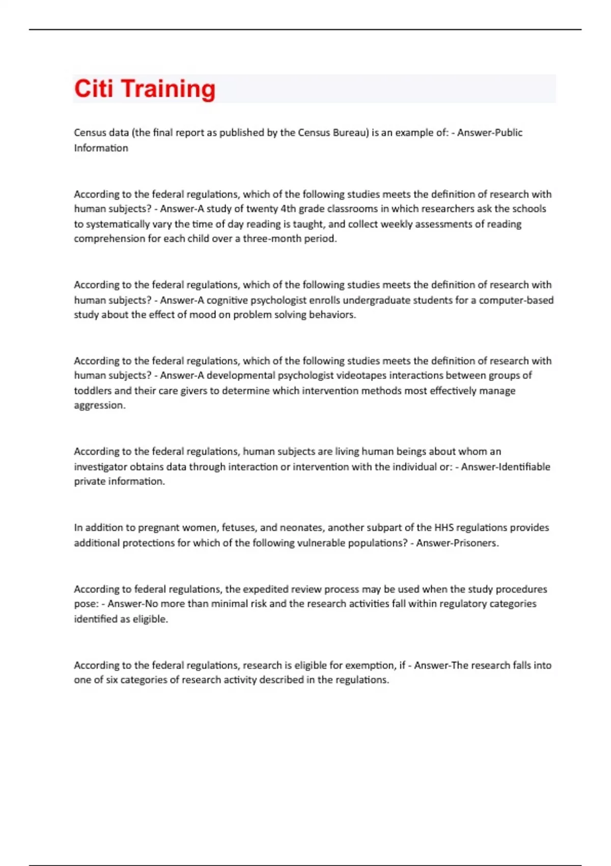 Census data (the final report as published by the Census Bureau) is an example of: - Answer-Public Information According to the federal regulations, which of the following studies meets the definition of research with human subjects? - Answer-A study of twenty 4th grade classrooms in which researchers ask the schools to systematically vary the time of day reading is taught, and collect weekly assessments of reading comprehension for each child over a three-month period. According to the federal regulations, which of the following studies meets the definition of research with human subjects? - Answer-A cognitive psychologist enrolls undergraduate students for a computer-based study about the effect of mood on problem solving behaviors. According to the federal regulations, which of the following studies meets the definition of research with human subjects? - Answer-A developmental psychologist videotapes interactions between groups of toddlers and their care givers to determine which intervention methods most effectively manage aggression. According to the federal regulations, human subjects are living human beings about whom an investigator obtains data through interaction or intervention with the individual or: - Answer-Identifiable private information. In addition to pregnant women, fetuses, and neonates, another subpart of the HHS regulations provides additional protections for which of the following vulnerable populations? - Answer-Prisoners. According to federal regulations, the expedited review process may be used when the study procedures pose: - Answer-No more than minimal risk and the research activities fall within regulatory categories identified as eligible. According to the federal regulations, research is eligible for exemption, if - Answer-The research falls into one of six categories of research activity described in the regulations.Which of the following statements about the relationship between an institution and the institution's IRB(s) is correct? - Answer-officials of the institution may overrule an IRB approval. Continuing review of an approved and ongoing protocol - Answer-Must occur within 12 months of the approval date. A subject in a clinical research trial experiences a serious, unanticipated adverse drug experience. How should the investigator proceed, with respect to the IRB, after the discovery of the adverse event occurrence? - Answer-Report the adverse drug experience in a timely manner, in keeping with the IRB's policies and procedures, using the forms or the mechanism provided by the IRB. How long is an investigator required to keep consent documents, IRB correspondence, and research records? - Answer-For a minimum of three years after completion of the study According to federal regulations, which of the following best describes when expedited review of a new, proposed study may be used by the IRB? - Answer-The study involves no more than minimal risk and meets one of the allowable categories of expedited review specified in federal regulations Amendments involving changes to IRB approved protocols do NOT need prior IRB approval if: - AnswerThe changes must be immediately implemented for the health and well being of the subject. IRB continuing review of an approved protocol must: - Answer-Occur at least annually