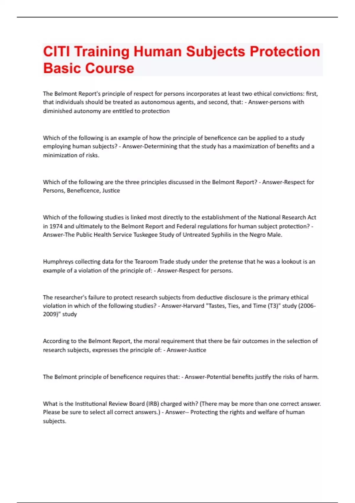 The Belmont Report's principle of respect for persons incorporates at least two ethical convictions: first, that individuals should be treated as autonomous agents, and second, that: - Answer-persons with diminished autonomy are entitled to protection Which of the following is an example of how the principle of beneficence can be applied to a study employing human subjects? - Answer-Determining that the study has a maximization of benefits and a minimization of risks. Which of the following are the three principles discussed in the Belmont Report? - Answer-Respect for Persons, Beneficence, Justice Which of the following studies is linked most directly to the establishment of the National Research Act in 1974 and ultimately to the Belmont Report and Federal regulations for human subject protection? - Answer-The Public Health Service Tuskegee Study of Untreated Syphilis in the Negro Male. Humphreys collecting data for the Tearoom Trade study under the pretense that he was a lookout is an example of a violation of the principle of: - Answer-Respect for persons. The researcher's failure to protect research subjects from deductive disclosure is the primary ethical violation in which of the following studies? - Answer-Harvard "Tastes, Ties, and Time (T3)" study (2006- 2009)" study According to the Belmont Report, the moral requirement that there be fair outcomes in the selection of research subjects, expresses the principle of: - Answer-Justice The Belmont principle of beneficence requires that: - Answer-Potential benefits justify the risks of harm. What is the Institutional Review Board (IRB) charged with? (There may be more than one correct answer. Please be sure to select all correct answers.) - Answer-- Protecting the rights and welfare of human subjects.- Assuring that all applicable institutional policies and federal regulations related to research with human subjects are followed. - Reviewing subject recruitment materials and strategies. Which type of IRB review does not require an IRB approval but does require a determination by the IRB or an IRB designee? - Answer-Exempt Which of the following studies need IRB approval? - Answer-Studies collecting data about living individuals. A student working on his dissertation plans on interviewing 15 principals in neighboring high schools. The student plans to collect data about the personal experiences the principals have had with disruptive students, what types of disciplinary actions were taken (including decisions they may have personally made), and their feelings or thoughts as to whether those actions were appropriate. Identifiers will be collected. This study would be categorized as which type of review? - Answer-Full Board Review The history of ethical regulations in human subjects research began with the - Answer-Nuremberg Code Per federal regulations, which of the following elements must be included in an informed consent document? - Answer-All foreseeable risks and discomforts. A medical record is an example of: - Answer-Private information A professor at Big State University is writing a biography about Bill Gates and conducting oral histories with all of Bill Gates' friends, family members, and business acquaintances. The researcher submits the research proposal to the institution's IRB. What action can he expect by the IRB? - Answer-The IRB will not review this study because it is not research as defined by the federal regulations. According to the federal regulations, human subjects are living individuals about whom an investigator conducting research obtains information through interaction or intervention with the individual, and uses, studies, or analyzes the information; or: - Answer-Obtains, uses, studies, analyzes, or generates identifiable private information.According to the federal regulations, which of the following studies meets the definition of research with human subjects? - Answer-A study of twenty 4th grade classrooms in which researchers ask the schools to systematically vary the time of day reading is taught, and collect weekly assessments of reading comprehension for each child over a three-month period. Census data (the final report as published by the Census Bureau) is an example of: - Answer-Public information Which of the following statements about the relationship between an institution and the institution's IRB(s) is correct? - Answer-Officials of the institution may overrule an IRB approval. Continuing review of an approved and ongoing study posing more than minimal risk that was initially approved by a convened IRB: - Answer-Must occur within 12 months of the approval date