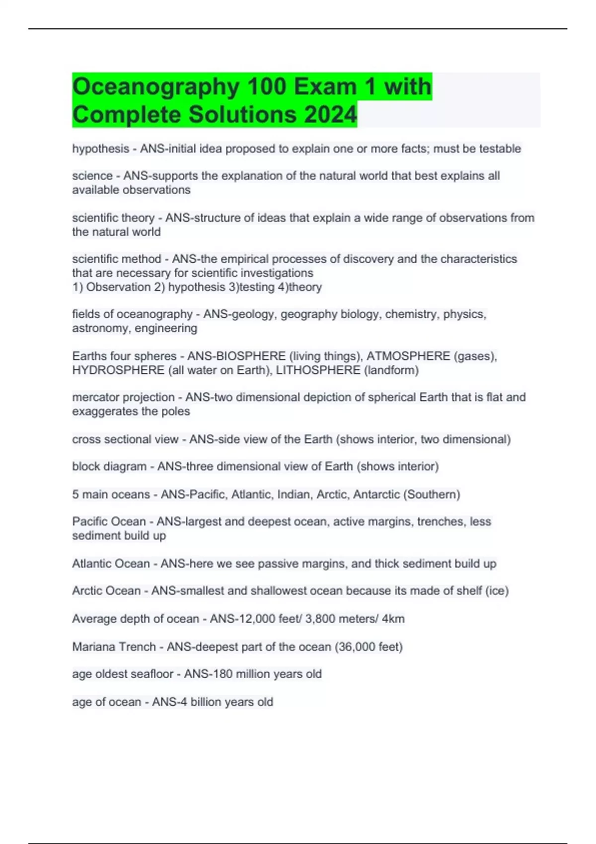 Oceanography 100 Exam 1 with Complete Solutions 2024