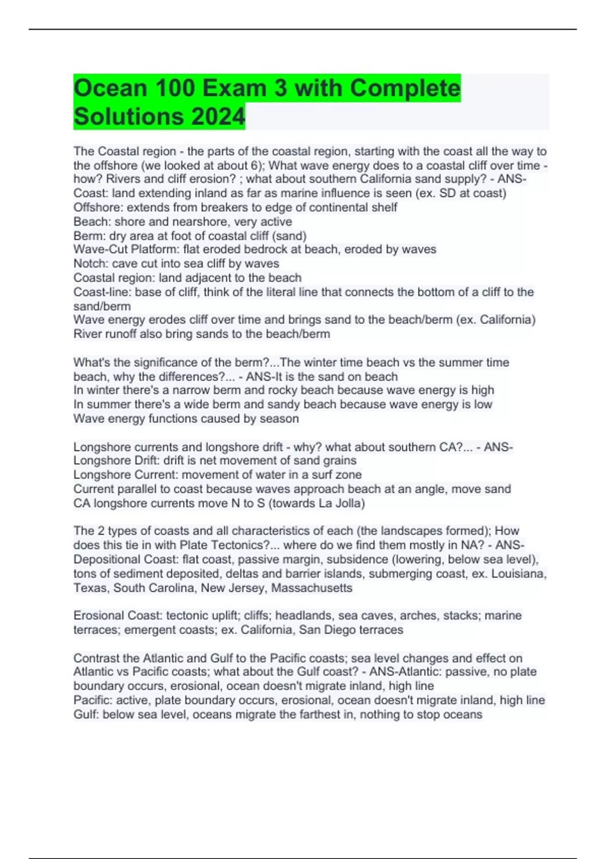 ocean 100 exam 3 with complete solutions 2024