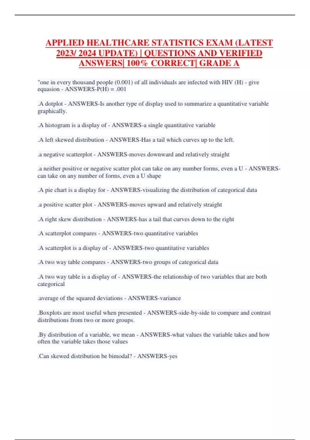 APPLIED HEALTHCARE STATISTICS EXAM (LATEST 2023/ 2024 UPDATE) | QUESTIONS AND VERIFIED ANSWERS| 100% CORRECT| GRADE A