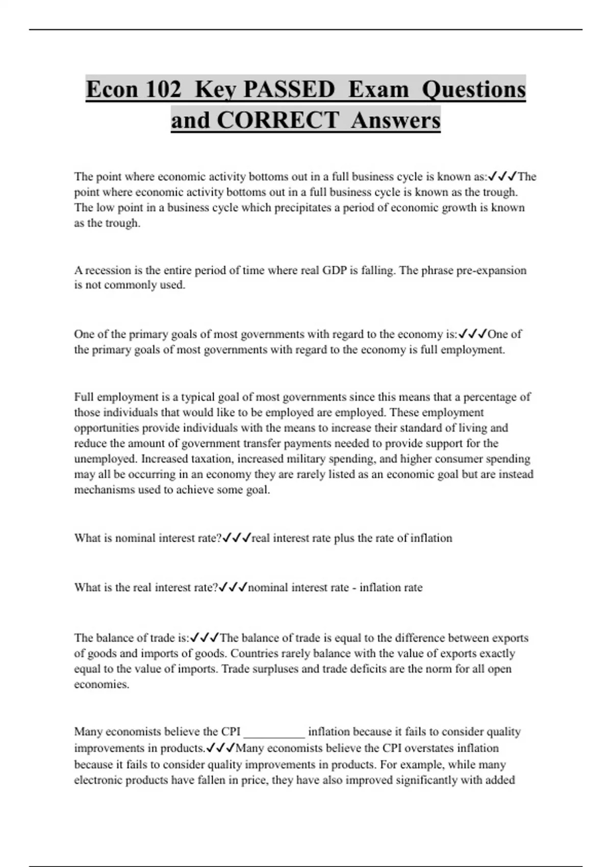 Econ 102 Key PASSED Exam Questions and CORRECT Answers