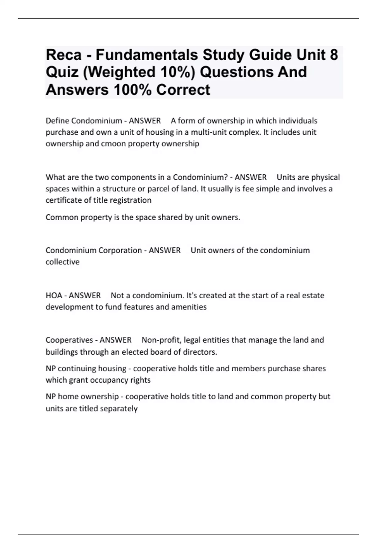 Reca - Fundamentals Study Guide Unit 8 Quiz (Weighted 10%) Questions And Answers 100% Verified