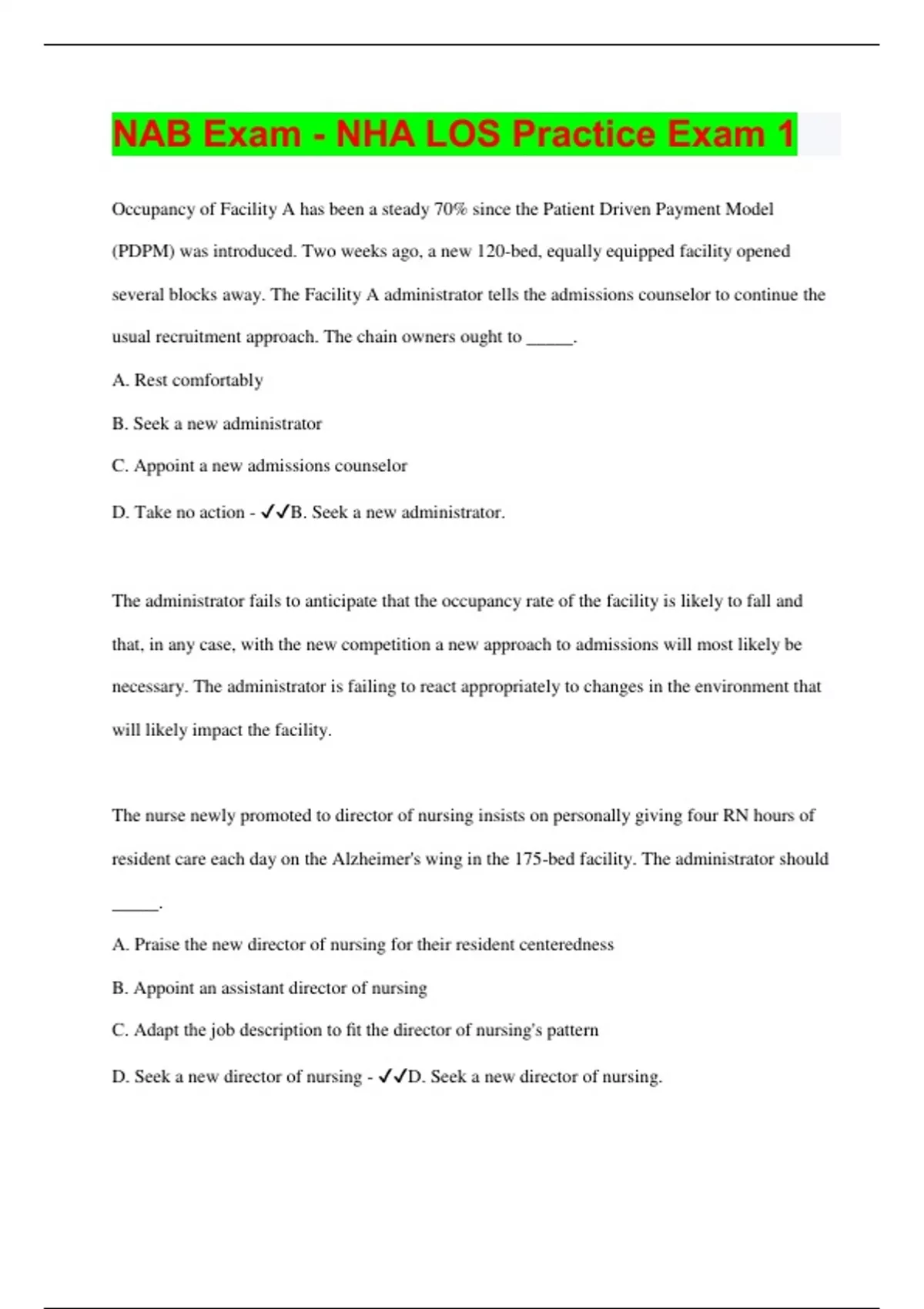 NAB Exam - NHA LOS Practice Exam 1 Occupancy of Facility A has been a steady 70% since the Patient Driven Payment Model (PDPM) was introduced. Two weeks ago, a new 120-bed, equally equipped facility opened several blocks away. The Facility A administrator tells the admissions counselor to continue the usual recruitment approach. The chain owners ought to _____. A. Rest comfortably B. Seek a new administrator C. Appoint a new admissions counselor D. Take no action - B. Seek a new administrator. The administrator fails to anticipate that the occupancy rate of the facility is likely to fall and that, in any case, with the new competition a new approach to admissions will most likely be necessary. The administrator is failing to react appropriately to changes in the environment that will likely impact the facility. The nurse newly promoted to director of nursing insists on personally giving four RN hours of resident care each day on the Alzheimer's wing in the 175-bed facility. The administrator should _____. A. Praise the new director of nursing for their resident centeredness B. Appoint an assistant director of nursing C. Adapt the job description to fit the director of nursing's pattern D. Seek a new director of nursing - D. Seek a new director of nursing. The director of nursing fails to understand that using expensive RN hours when less expensive licensed practical nurse (LPN) and certified nurse's assistant (CNA) hours are the industry standard will be unsustainably expensive for the facility. Additionally, the director of nursing is not a direct care role, and their time should be spent in other applicable areas for their position. The newly hired assistant to the administrator insists that the organizational chart dotted line between this position and the Department of Nursing should be a solid line. The administrator should _____. A. Agree in general B. Agree to this special case C. Ask the director of nursing for their opinion D. Be forewarned - D. Be forewarned. The director of nursing normally reports directly to the administrator. The assistant administrator wants too much power or does not understand how normal nursing facilities function The nursing facility administrator who, using the leadership by walking around (LBWA) technique, succeeds in making appropriate corrections on the spot during their rounds _____. A. Is effectively implementing the concept B. Gains additional power through the process C. Exhibits appropriate leadership D. Does not understand LBWA - D. Does not understand LBWA. It is normally better to go through the chain of command and let the employees' immediate supervisor request the corrections. When the administrator notices that the director of nursing seeks to turn as many duties as possible over to housekeeping, the administrator should conclude that the director of nursing is _____. A. Behaving normally, but worthy of oversight B, Holding a grudge against housekeeping C. Unwilling to be cooperative D. Wielding power desirably - A. Behaving normally, but worthy of oversight. It is normal for the various departments such as nursing, housekeeping, and dietary to seek to "turn over" as much work to other departments as they can. The administrator notices that incident reports are being insufficiently filled out, but does nothing, believing that the situation will likely correct itself. The administrator is _____. A. Practicing effective control B. Likely to be correct C. Failing to control effectively D. Right to monitor the situation for a period - C. Failing to control effectively. Correctly filled-out incident reports are a must for the facility and this situation is not likely to "correct itself" without the administrator's active intervention. This is a very significant area of concern and can quickly lead to immediate jeopardy level