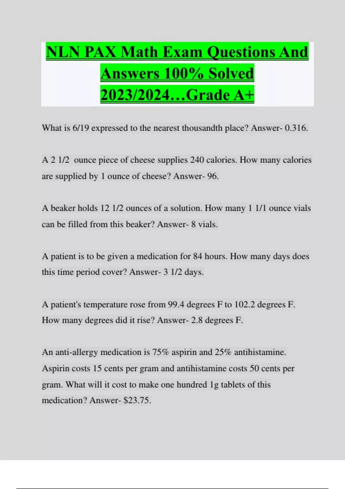 NLN PAX Math Exam Questions And Answers 100% Solved 2023/2024…Grade A+ What is 6/19 expressed to the nearest thousandth place? Answer- 0.316. A 2 1/2 ounce piece of cheese supplies 240 calories. How many calories are supplied by 1 ounce of cheese? Answer- 96. A beaker holds 12 1/2 ounces of a solution. How many 1 1/1 ounce vials can be filled from this beaker? Answer- 8 vials. A patient is to be given a medication for 84 hours. How many days does this time period cover? Answer- 3 1/2 days. A patient's temperature rose from 99.4 degrees F to 102.2 degrees F. How many degrees did it rise? Answer- 2.8 degrees F. An anti-allergy medication is 75% aspirin and 25% antihistamine.