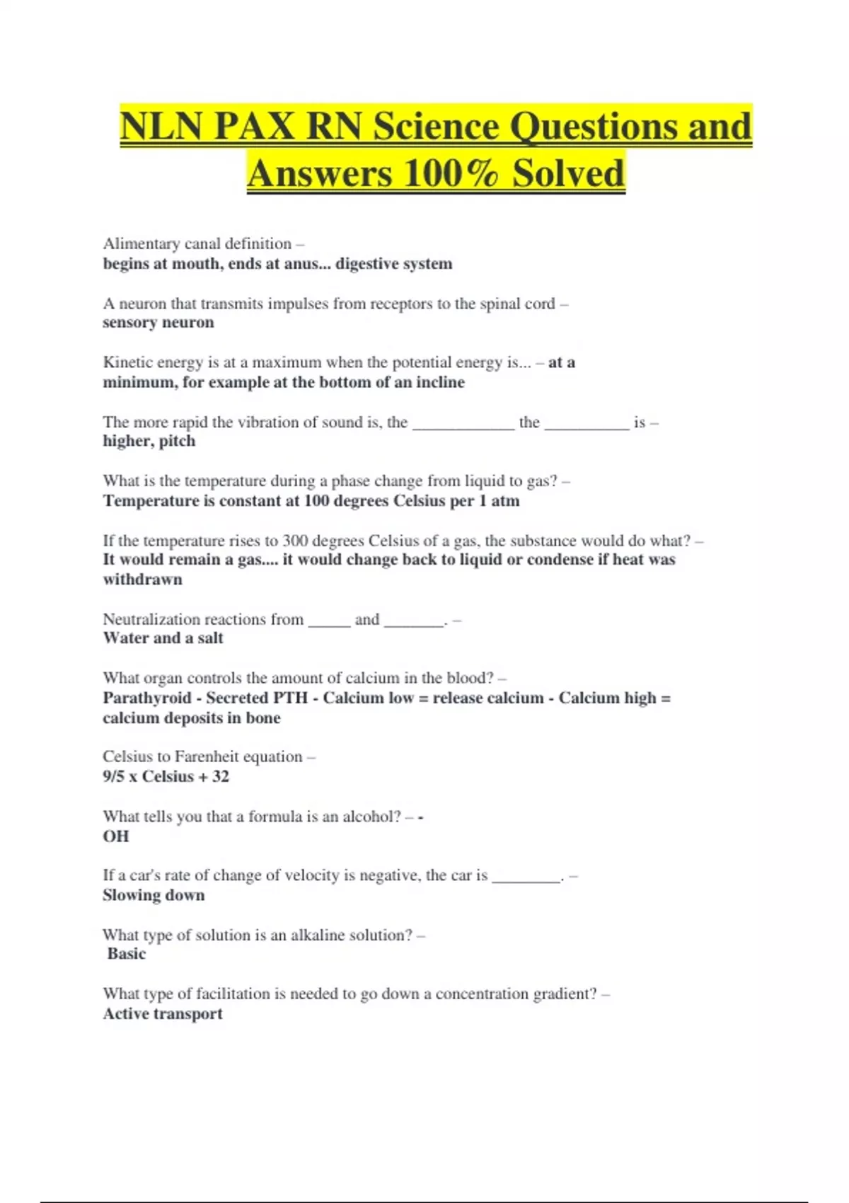 NLN PAX RN Science Questions and Answers 100% Solved Alimentary canal definition – begins at mouth, ends at anus... digestive system A neuron that transmits impulses from receptors to the spinal cord – sensory neuron Kinetic energy is at a maximum when the potential energy is... – at a minimum, for example at the bottom of an incline The more rapid the vibration of sound is, the ____________ the __________ is – higher, pitch What is the temperature during a phase change from liquid to gas? – Temperature is constant at 100 degrees Celsius per 1 atm If the temperature rises to 300 degrees Celsius of a gas, the substance would do what? – It would remain a gas.... it would change back to liquid or condense if heat was withdrawn Neutralization reactions from _____ and _______. – Water and a salt What organ controls the amount of calcium in the blood? – Parathyroid - Secreted PTH - Calcium low = release calcium - Calcium high = calcium deposits in bone Celsius to Farenheit equation – 9/5 x Celsius + 32