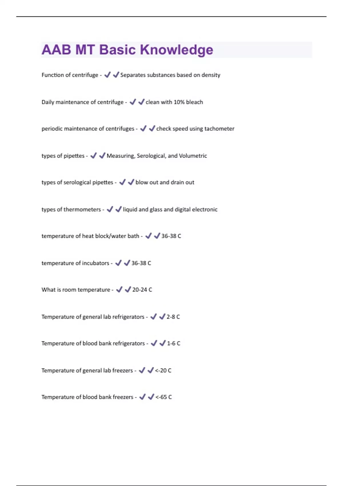 Function of centrifuge - Separates substances based on density Daily maintenance of centrifuge - clean with 10% bleach periodic maintenance of centrifuges - check speed using tachometer types of pipettes - Measuring, Serological, and Volumetric types of serological pipettes - blow out and drain out types of thermometers - liquid and glass and digital electronic temperature of heat block/water bath - 36-38 C temperature of incubators - 36-38 C What is room temperature - 20-24 C Temperature of general lab refrigerators - 2-8 C Temperature of blood bank refrigerators - 1-6 C Temperature of general lab freezers - <-20 C Temperature of blood bank freezers - <-65 C
