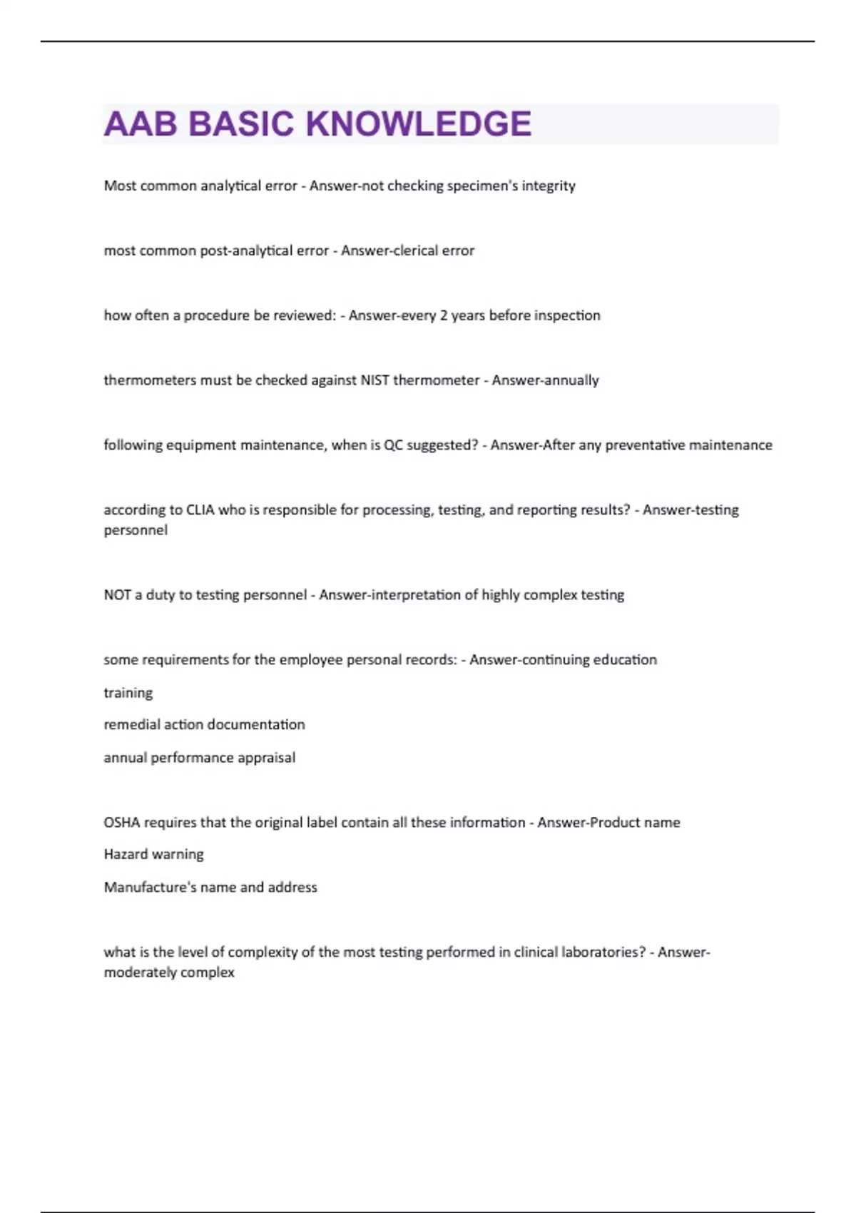 Most common analytical error - Answer-not checking specimen's integrity most common post-analytical error - Answer-clerical error how often a procedure be reviewed: - Answer-every 2 years before inspection thermometers must be checked against NIST thermometer - Answer-annually following equipment maintenance, when is QC suggested? - Answer-After any preventative maintenance according to CLIA who is responsible for processing, testing, and reporting results? - Answer-testing personnel NOT a duty to testing personnel - Answer-interpretation of highly complex testing some requirements for the employee personal records: - Answer-continuing education training remedial action documentation annual performance appraisal OSHA requires that the original label contain all these information - Answer-Product name Hazard warning Manufacture's name and address what is the level of complexity of the most testing performed in clinical laboratories? - Answermoderately complexCLIA required inspectrion, how often? - Answer-every 2 years labs that DO NOT require to participate in proficiency testing - Answer-waived testing only CLIA performance criteria - Answer-Failed 2 analytes in 1 PT event Failed 3 analytes in 1 PT event Failed the same analytes in 2 consecutive PT event Failed 2 different analytes in the last 2 pt event alternative proficiency testing example: - Answer-splits samples to another facility using the same test method what does MSDS mean? - Answer-Material Safety Data Sheet complexity test is regulated by: - Answer-CLIA checking centrifuge and the rpm. Equipment and Maintenance is : called - Answer-Quality Control Pre-Analytical- Quality assurance Lab request - Answer-specimen collection patient identification venipuncture process specimen rejection analytical phase- proficiency testing, QC program - Answer-equipment calibration Quality Control procedure specimen integrity Post-Analytical- quality assurance - Answer-result reporting critical valuesnotification guidelines what should be included in the record filee of the worker personnel? - Answer-HIPAA regulation known by the employee The blue filter modifies the yellow effect on the light giving it a more white light effect - Answer-to eliminate the yellow color emitted by the tungsten light bulb the oil immersion is used for? - Answer-it gathers light for the objective and increase resolution. type B (high viscosity) is commonly used. The X and Y in the microscope are used for: - Answer-the values obtained bared plotted on the x and y axis. This moves the mechanical stage or base left to right and the y moves up and down or front to back. sharp container is an: - Answer-engineering control NO sharps is in: - Answer-Biohazard bag precision means: - Answer-closeness of repeat results (reproducibility). describes how close test results are to one another when repeated analysis of the same material is performed.