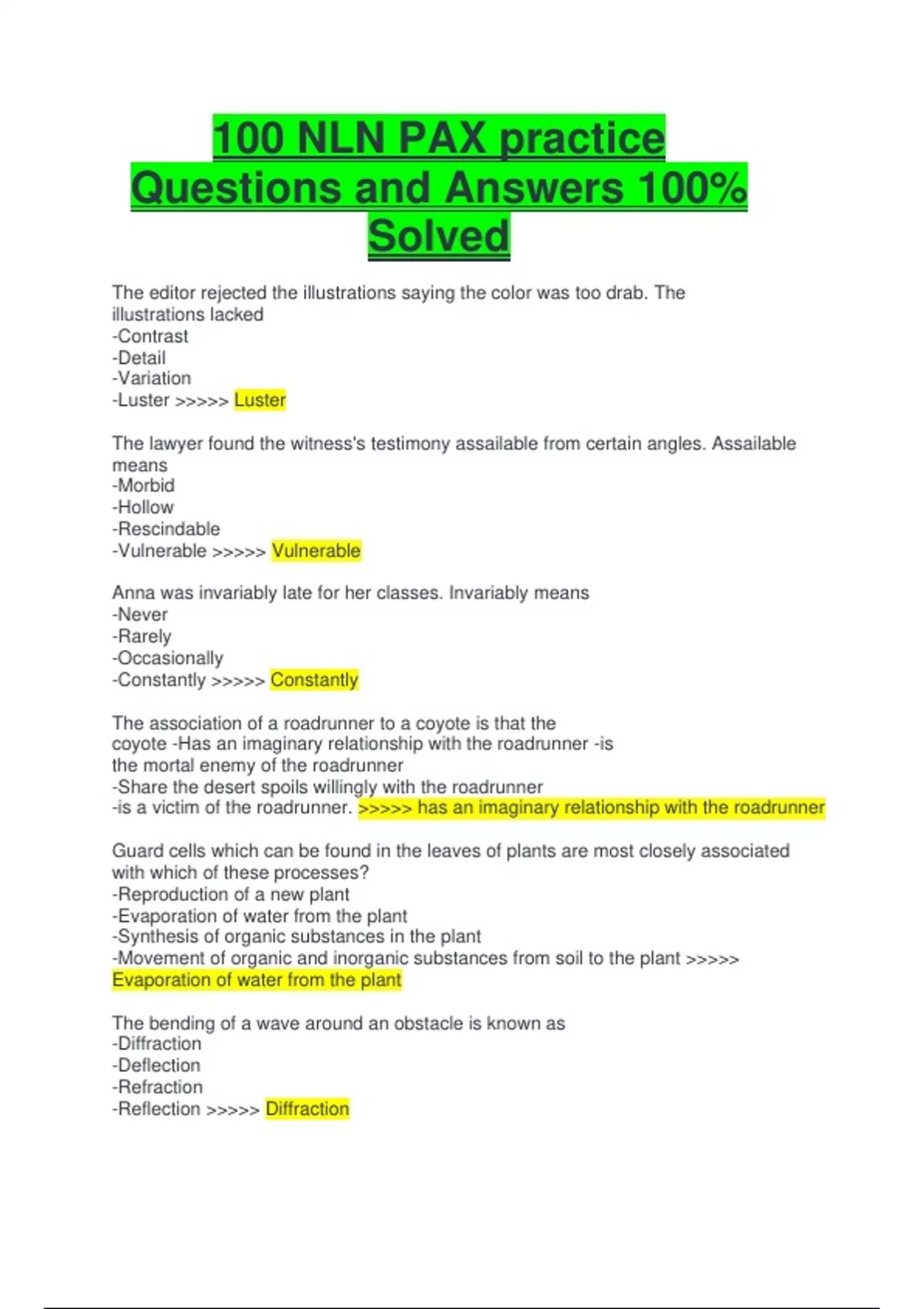 100 NLN PAX practice Questions and Answers 100% Solved The editor rejected the illustrations saying the color was too drab. The illustrations lacked -Contrast -Detail -Variation -Luster >>>>> Luster The lawyer found the witness's testimony assailable from certain angles. Assailable means -Morbid -Hollow -Rescindable -Vulnerable >>>>> Vulnerable Anna was invariably late for her classes. Invariably means -Never -Rarely -Occasionally -Constantly >>>>> Constantly The association of a roadrunner to a coyote is that the coyote -Has an imaginary relationship with the roadrunner -is the mortal enemy of the roadrunner -Share the desert spoils willingly with the roadrunner -is a victim of the roadrunner. >>>>> has an imaginary relationship with the roadrunner Guard cells which can be found in the leaves of plants are most closely associated with which of these processes? -Reproduction of a new plant -Evaporation of water from the plant -Synthesis of organic substances in the plant -Movement of organic and inorganic substances from soil to the plant >>>>> Evaporation of water from the plant