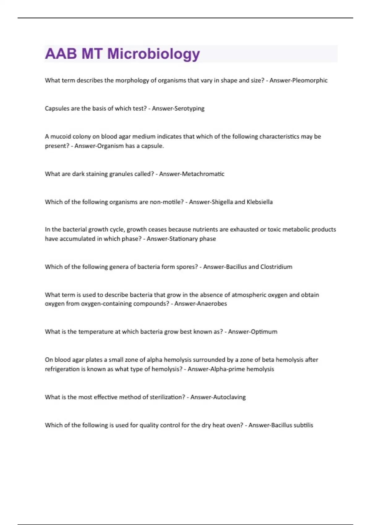 AAB MT Microbiology Questions And Answers Solved 100% Correct