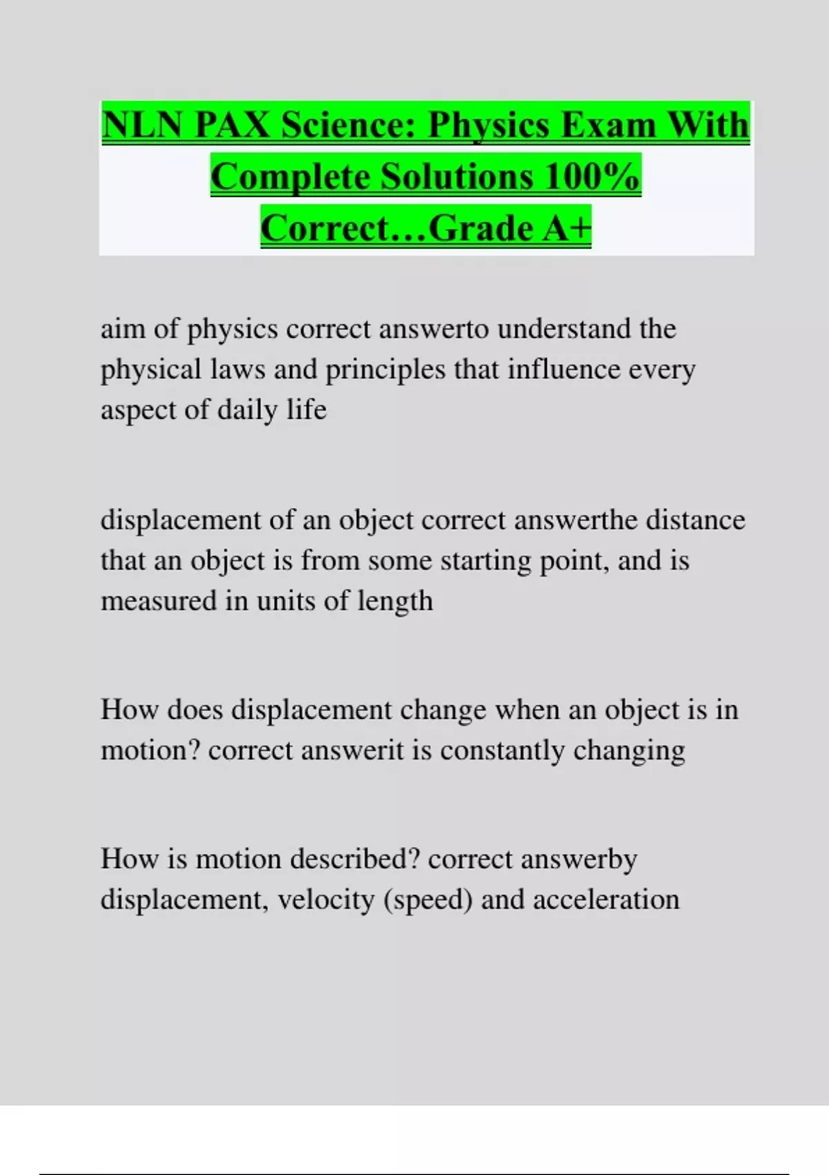 NLN PAX Science: Physics Exam With Complete Solutions 100% Correct…Grade A+ aim of physics correct answerto understand the physical laws and principles that influence every aspect of daily life displacement of an object correct answerthe distance that an object is from some starting point, and is measured in units of length How does displacement change when an object is in motion? correct answerit is constantly changing