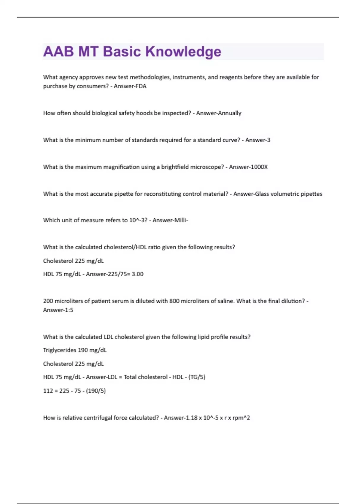 What agency approves new test methodologies, instruments, and reagents before they are available for purchase by consumers? - Answer-FDA How often should biological safety hoods be inspected? - Answer-Annually What is the minimum number of standards required for a standard curve? - Answer-3 What is the maximum magnification using a brightfield microscope? - Answer-1000X What is the most accurate pipette for reconstituting control material? - Answer-Glass volumetric pipettes Which unit of measure refers to 10^-3? - Answer-MilliWhat is the calculated cholesterol/HDL ratio given the following results? Cholesterol 225 mg/dL HDL 75 mg/dL - Answer-225/75= 3.00 200 microliters of patient serum is diluted with 800 microliters of saline. What is the final dilution? - Answer-1:5 What is the calculated LDL cholesterol given the following lipid profile results? Triglycerides 190 mg/dL Cholesterol 225 mg/dL HDL 75 mg/dL - Answer-LDL = Total cholesterol - HDL - (TG/5) 112 = 225 - 75 - (190/5) How is relative centrifugal force calculated? - Answer-1.18 x 10^-5 x r x rpm^2A chain of custody is required for all of the following: - Answer-Legal blood alcohol, pre-employment drug screen, and paternity testing A chain of custody is required for all of the following, EXCEPT: - Answer-Fetal fibronectin What federal legislation regulates most clinical laboratories? - Answer-Clinical Laboratory Improvement Amendments (CLIA) What is the level of complexity of most testing performed in clinical laboratories? - Answer-Moderately complex How often does CLIA require clinical laboratories to have inspections? - Answer-Every 2 years Which laboratories are NOT required to participate in proficiency testing? - Answer-Laboratories performing waived testing only. Which proficiency testing (PT) results do not meet the CLIA performance criteria? - Answer-Failed the same analyte in two consecutive PT events Which one of the following is an example of alternate proficiency testing? - Answer-Split samples sent to another facility using the same test method. All of the following are pre-analytical errors except which one? - Answer-Transcription error entering a manual result All of the following are pre-analytical erros: - Answer-Ordering a lab test under the wrong patient number, misidentification of a patient, mislabeling an add-on test Which one of the following is the most common analytical error? - Answer-Not checking specimen integrityWhat is the most common post-analytical error? - Answer-Clerical errors How often must a procedure be reviewed? - Answer-Annual review is required How often must thermometers be checked against the NIST thermometer? - Answer-Annually