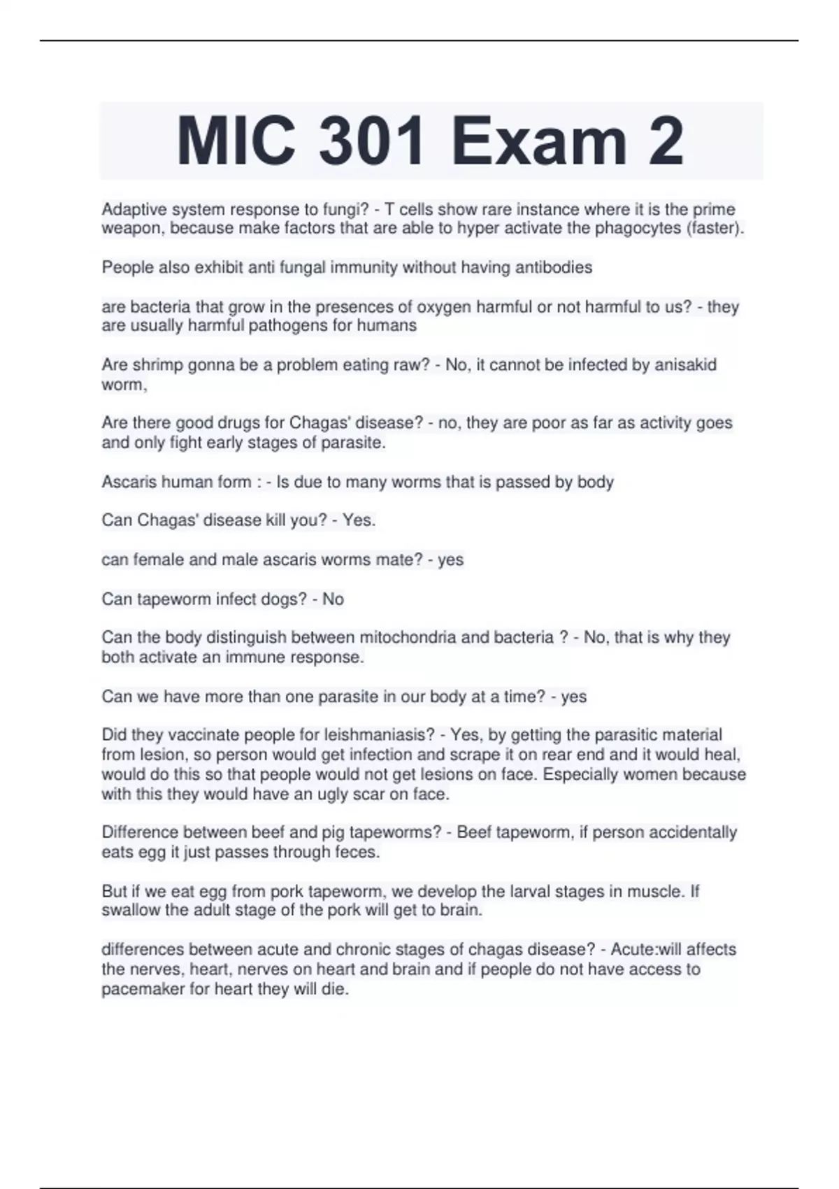 Adaptive system response to fungi? - T cells show rare instance where it is the prime weapon, because make factors that are able to hyper activate the phagocytes (faster). People also exhibit anti fungal immunity without having antibodies are bacteria that grow in the presences of oxygen harmful or not harmful to us? - they are usually harmful pathogens for humans Are shrimp gonna be a problem eating raw? - No, it cannot be infected by anisakid worm, Are there good drugs for Chagas' disease? - no, they are poor as far as activity goes and only fight early stages of parasite. Ascaris human form : - Is due to many worms that is passed by body Can Chagas' disease kill you? - Yes. can female and male ascaris worms mate? - yes Can tapeworm infect dogs? - No Can the body distinguish between mitochondria and bacteria ? - No, that is why they both activate an immune response. Can we have more than one parasite in our body at a time? - yes Did they vaccinate people for leishmaniasis? - Yes, by getting the parasitic material from lesion, so person would get infection and scrape it on rear end and it would heal, would do this so that people would not get lesions on face. Especially women because with this they would have an ugly scar on face. Difference between beef and pig tapeworms? - Beef tapeworm, if person accidentally eats egg it just passes through feces. But if we eat egg from pork tapeworm, we develop the larval stages in muscle. If swallow the adult stage of the pork will get to brain. differences between acute and chronic stages of chagas disease? - Acute:will affects the nerves, heart, nerves on heart and brain and if people do not have access to pacemaker for heart they will die.