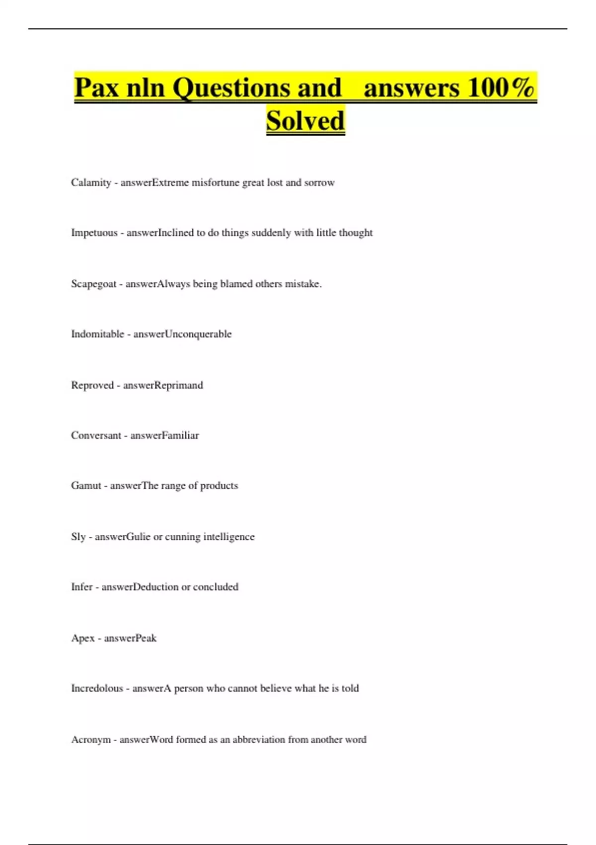 Pax nln Questions and answers 100% Solved Calamity - answerExtreme misfortune great lost and sorrow Impetuous - answerInclined to do things suddenly with little thought Scapegoat - answerAlways being blamed others mistake. Indomitable - answerUnconquerable Reproved - answerReprimand Conversant - answerFamiliar Gamut - answerThe range of products Sly - answerGulie or cunning intelligence Infer - answerDeduction or concluded Apex - answerPeak
