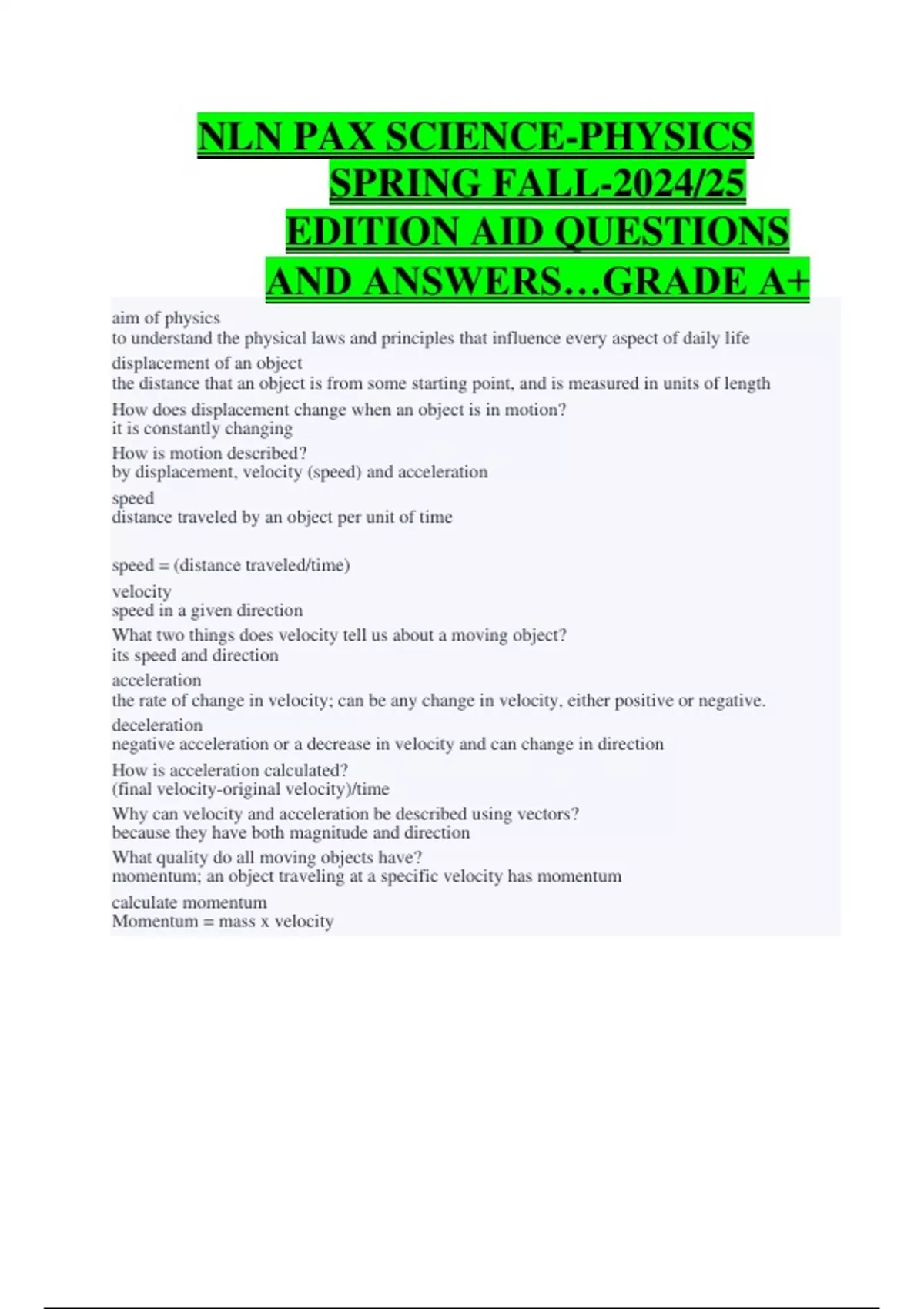 NLN PAX SCIENCE-PHYSICS SPRING FALL-2024/25 EDITION AID QUESTIONS AND ANSWERS…GRADE A+ aim of physics to understand the physical laws and principles that influence every aspect of daily life displacement of an object the distance that an object is from some starting point, and is measured in units of length How does displacement change when an object is in motion? it is constantly changing How is motion described? by displacement, velocity (speed) and acceleration speed distance traveled by an object per unit of time speed = (distance traveled/time) velocity speed in a given direction What two things does velocity tell us about a moving object? its speed and direction acceleration the rate of change in velocity; can be any change in velocity, either positive or negative. deceleration negative acceleration or a decrease in velocity and can change in direction How is acceleration calculated? (final velocity-original velocity)/time