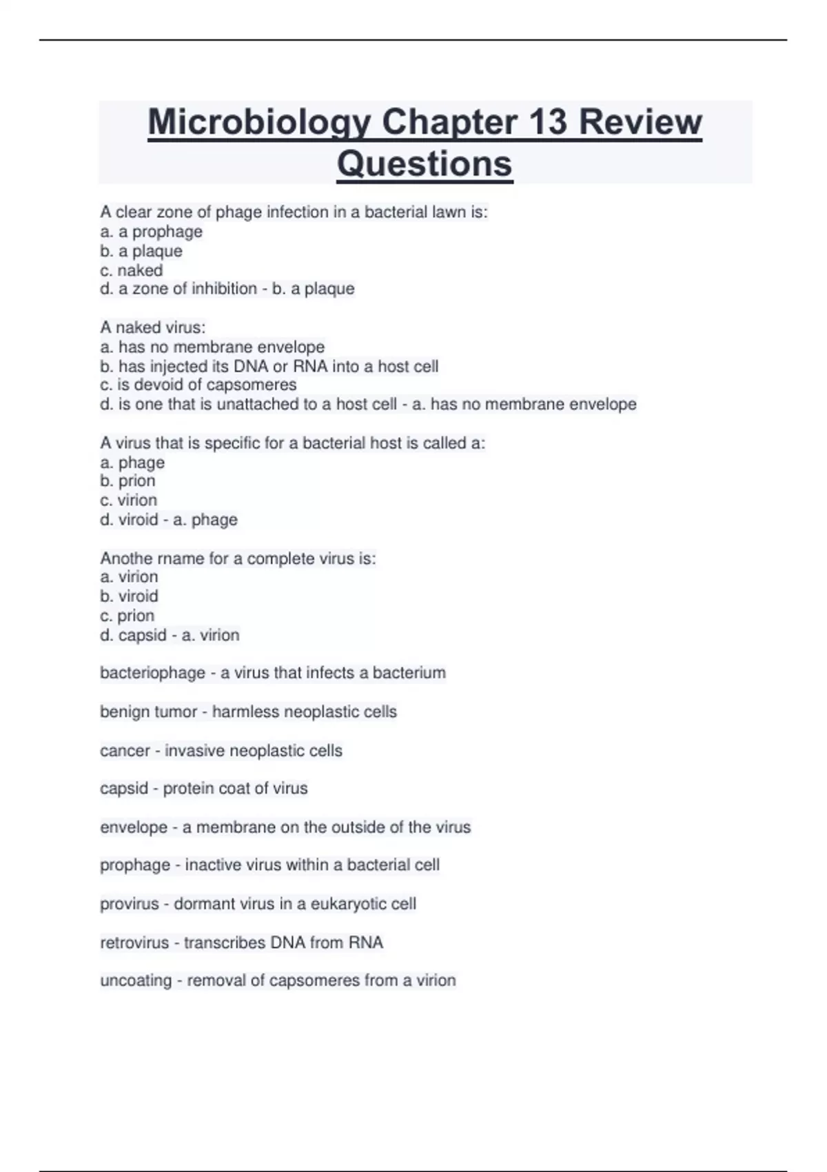 A clear zone of phage infection in a bacterial lawn is: a. a prophage b. a plaque c. naked d. a zone of inhibition - b. a plaque A naked virus: a. has no membrane envelope b. has injected its DNA or RNA into a host cell c. is devoid of capsomeres d. is one that is unattached to a host cell - a. has no membrane envelope A virus that is specific for a bacterial host is called a: a. phage b. prion c. virion d. viroid - a. phage Anothe rname for a complete virus is: a. virion b. viroid c. prion d. capsid - a. virion bacteriophage - a virus that infects a bacterium benign tumor - harmless neoplastic cells cancer - invasive neoplastic cells capsid - protein coat of virus envelope - a membrane on the outside of the virus prophage - inactive virus within a bacterial cell provirus - dormant virus in a eukaryotic cell retrovirus - transcribes DNA from RNA uncoating - removal of capsomeres from a virion virion - complete viral particle When a eukaryotic cell is infected with an enveloped virus and sheds viruses slowly over time, this infection is: a. called a lytic infection b. a prophage cycle c. called a persistent infection d. caused by a quiescent virus - c. called a persistent infection