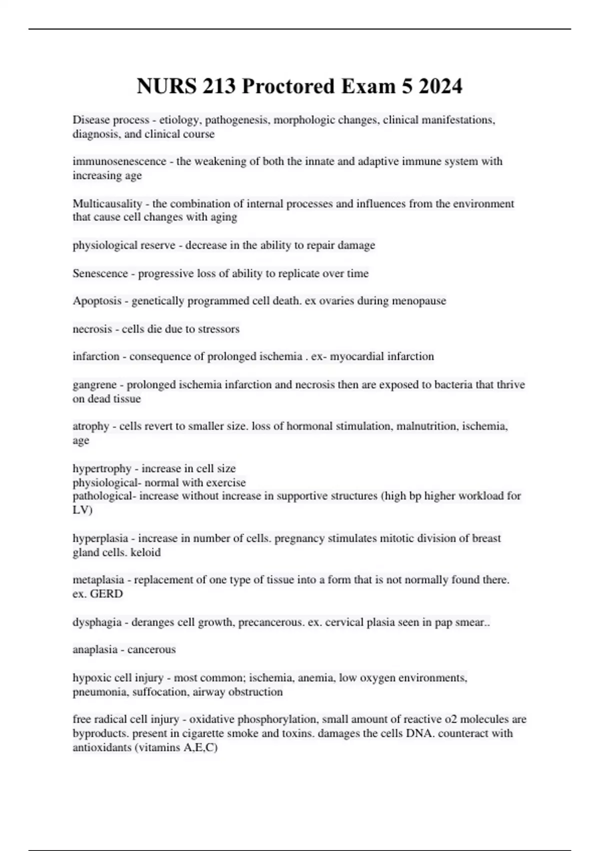 Disease process - etiology, pathogenesis, morphologic changes, clinical manifestations, diagnosis, and clinical course immunosenescence - the weakening of both the innate and adaptive immune system with increasing age Multicausality - the combination of internal processes and influences from the environment that cause cell changes with aging physiological reserve - decrease in the ability to repair damage Senescence - progressive loss of ability to replicate over time Apoptosis - genetically programmed cell death. ex ovaries during menopause necrosis - cells die due to stressors infarction - consequence of prolonged ischemia . ex- myocardial infarction gangrene - prolonged ischemia infarction and necrosis then are exposed to bacteria that thrive on dead tissue atrophy - cells revert to smaller size. loss of hormonal stimulation, malnutrition, ischemia, age hypertrophy - increase in cell size physiological- normal with exercise pathological- increase without increase in supportive structures (high bp higher workload for LV) hyperplasia - increase in number of cells. pregnancy stimulates mitotic division of breast gland cells. keloid metaplasia - replacement of one type of tissue into a form that is not normally found there. ex. GERD dysphagia - deranges cell growth, precancerous. ex. cervical plasia seen in pap smear.. anaplasia - cancerous hypoxic cell injury - most common; ischemia, anemia, low oxygen environments, pneumonia, suffocation, airway obstruction free radical cell injury - oxidative phosphorylation, small amount of reactive o2 molecules are byproducts. present in cigarette smoke and toxins. damages the cells DNA. counteract with antioxidants (vitamins A,E,C) Acute inflammation stage 1 - vascular permeability; histamine and bradykinin enable vasodilation, more permeable permitting fluids, WBC, and platelets to travel in. Area is warm and red (erythema) and swollen. acute inflammation stage 2 - cellular chemotaxis; chemical signal attracts more platelets and WBC to site. WBC-cytokines, modulate by activating or inhibiting response. margination- wbc line up acute inflammation stage 3 - systemic response; symptoms throughout body, fever, pain lymphadenopathy, lethargy, etc chonic inflammation - characterized by macrophages; cause tissue damage. granuloma- where macrophages have aggregated and transform into epithelial like cells leading to tubercle. Acute inlammation - characterized by neutrophils; first to site Skin wound healing (3 processes) - 1-inflammation 2-proliferation, fibroblast synthesizes collagen, form granulation tissue. 3-maturation and remodeling exudate - purulent drainage. fluid leaving capillaries is protein rich filtrate containing wbc, microbial organisms, and cellular debris primary intention - -Clean laceration that requires simple re-epithelialization when edges are approximated •Example: Surgical Laceration secondary intention - -A wound with a large gap in tissue -some of the tissue has been gouged out Ex. decubitus ulcer tertiary intention - large gap from missing tissue has been contaminated and needs drainage tube while healing requires skingraft mast cells - release histamine histamine - -inflammatory mediator released from basophils, platelets, and mast cells. -causes vasodilation -sneezing, runny nose, eye tearing are consequences of histamine released in URT -benedryl is antihistamine