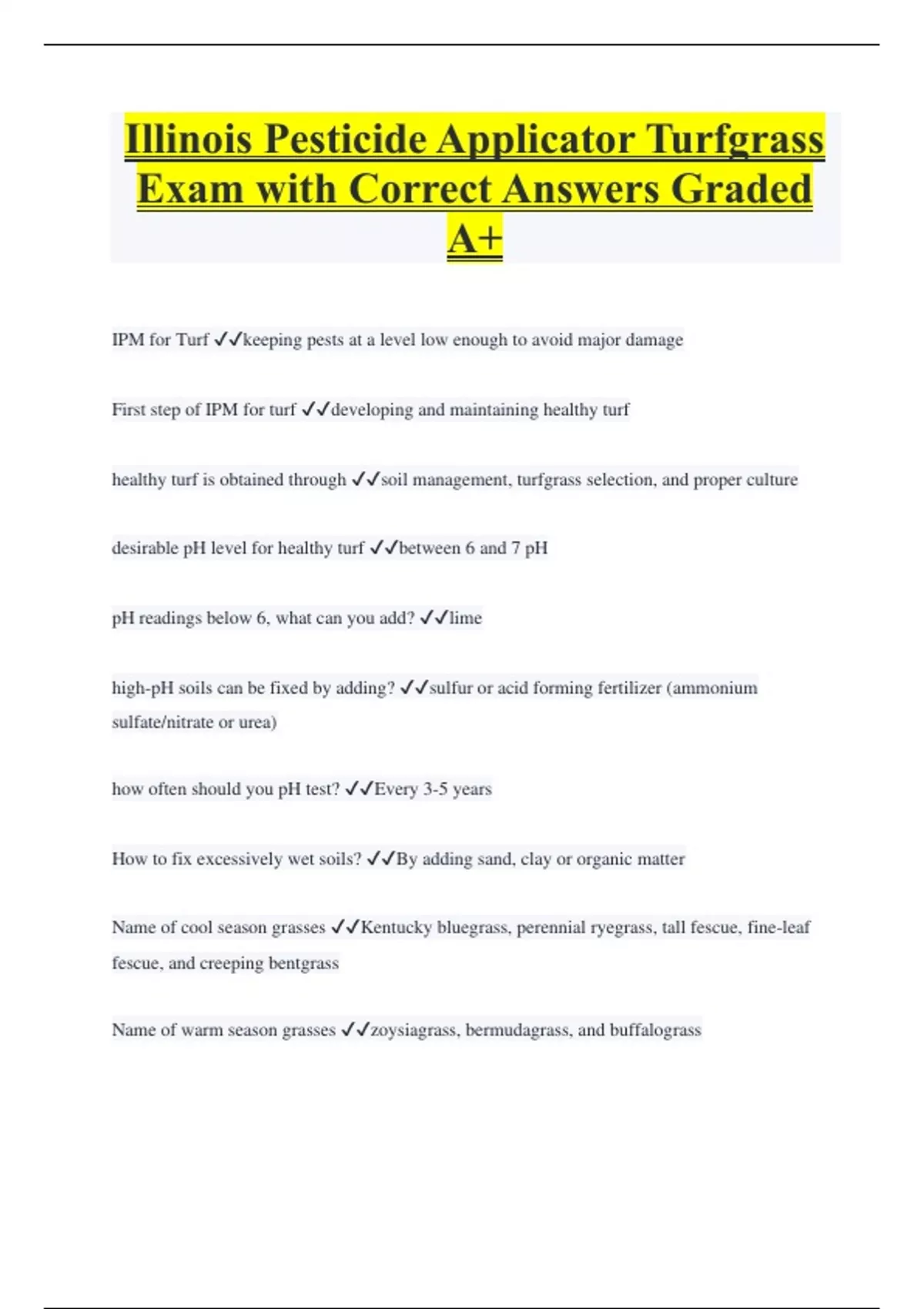 Illinois Pesticide Applicator Turfgrass Exam with Correct Answers Graded A+ IPM for Turf keeping pests at a level low enough to avoid major damage First step of IPM for turf developing and maintaining healthy turf healthy turf is obtained through soil management, turfgrass selection, and proper culture desirable pH level for healthy turf between 6 and 7 pH pH readings below 6, what can you add? lime high-pH soils can be fixed by adding? sulfur or acid forming fertilizer (ammonium sulfate/nitrate or urea) how often should you pH test? Every 3-5 years How to fix excessively wet soils? By adding sand, clay or organic matter Name of cool season grasses Kentucky bluegrass, perennial ryegrass, tall fescue, fine-leaf fescue, and creeping bentgrass