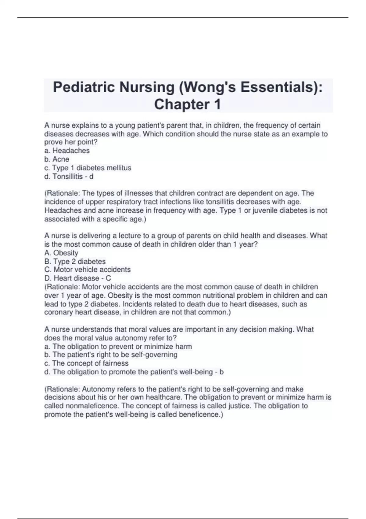 A nurse explains to a young patient's parent that, in children, the frequency of certain diseases decreases with age. Which condition should the nurse state as an example to prove her point? a. Headaches b. Acne c. Type 1 diabetes mellitus d. Tonsillitis - d (Rationale: The types of illnesses that children contract are dependent on age. The incidence of upper respiratory tract infections like tonsillitis decreases with age. Headaches and acne increase in frequency with age. Type 1 or juvenile diabetes is not associated with a specific age.) A nurse is delivering a lecture to a group of parents on child health and diseases. What is the most common cause of death in children older than 1 year? A. Obesity B. Type 2 diabetes C. Motor vehicle accidents D. Heart disease - C (Rationale: Motor vehicle accidents are the most common cause of death in children over 1 year of age. Obesity is the most common nutritional problem in children and can lead to type 2 diabetes. Incidents related to death due to heart diseases, such as coronary heart disease, in children are not that common.) A nurse understands that moral values are important in any decision making. What does the moral value autonomy refer to? a. The obligation to prevent or minimize harm b. The patient's right to be self-governing c. The concept of fairness d. The obligation to promote the patient's well-being - b (Rationale: Autonomy refers to the patient's right to be self-governing and make decisions about his or her own healthcare. The obligation to prevent or minimize harm is called nonmaleficence. The concept of fairness is called justice. The obligation to promote the patient's well-being is called beneficence.)