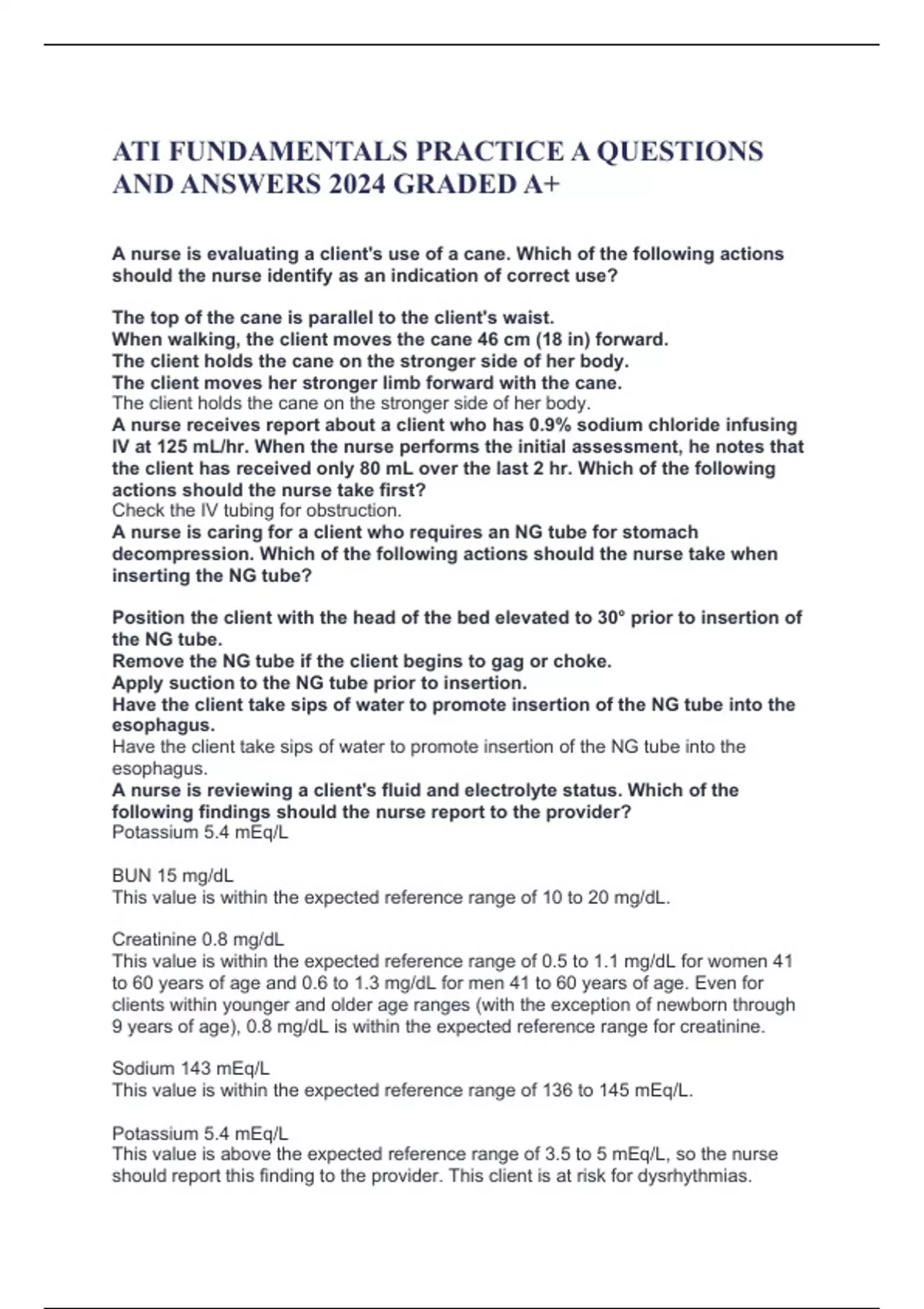 ATI FUNDAMENTALS PRACTICE A QUESTIONS AND ANSWERS 2024 GRADED A+ A nurse is evaluating a client's use of a cane. Which of the following actions should the nurse identify as an indication of correct use? The top of the cane is parallel to the client's waist. When walking, the client moves the cane 46 cm (18 in) forward. The client holds the cane on the stronger side of her body. The client moves her stronger limb forward with the cane. The client holds the cane on the stronger side of her body. A nurse receives report about a client who has 0.9% sodium chloride infusing IV at 125 mL/hr. When the nurse performs the initial assessment, he notes that the client has received only 80 mL over the last 2 hr. Which of the following actions should the nurse take first? Check the IV tubing for obstruction. A nurse is caring for a client who requires an NG tube for stomach decompression. Which of the following actions should the nurse take when inserting the NG tube? Position the client with the head of the bed elevated to 30° prior to insertion of the NG tube. Remove the NG tube if the client begins to gag or choke. Apply suction to the NG tube prior to insertion. Have the client take sips of water to promote insertion of the NG tube into the esophagus. Have the client take sips of water to promote insertion of the NG tube into the esophagus. A nurse is reviewing a client's fluid and electrolyte status. Which of the following findings should the nurse report to the provider? Potassium 5.4 mEq/L BUN 15 mg/dL This value is within the expected reference range of 10 to 20 mg/dL. Creatinine 0.8 mg/dL This value is within the expected reference range of 0.5 to 1.1 mg/dL for women 41 to 60 years of age and 0.6 to 1.3 mg/dL for men 41 to 60 years of age. Even for clients within younger and older age ranges (with the exception of newborn through 9 years of age), 0.8 mg/dL is within the expected reference range for creatinine. Sodium 143 mEq/L This value is within the expected reference range of 136 to 145 mEq/L. Potassium 5.4 mEq/L This value is above the expected reference range of 3.5 to 5 mEq/L, so the nurse should report this finding to the provider. This client is at risk for dysrhythmias.