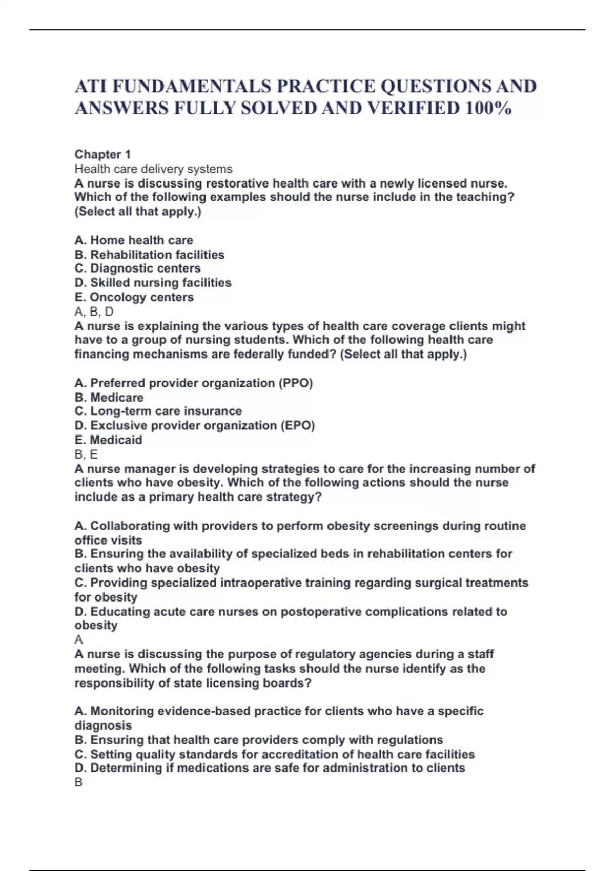 ATI FUNDAMENTALS PRACTICE QUESTIONS AND ANSWERS FULLY SOLVED AND VERIFIED 100% Chapter 1 Health care delivery systems A nurse is discussing restorative health care with a newly licensed nurse. Which of the following examples should the nurse include in the teaching? (Select all that apply.) A. Home health care B. Rehabilitation facilities C. Diagnostic centers D. Skilled nursing facilities E. Oncology centers A, B, D A nurse is explaining the various types of health care coverage clients might have to a group of nursing students. Which of the following health care financing mechanisms are federally funded? (Select all that apply.) A. Preferred provider organization (PPO) B. Medicare C. Long term care insurance D. Exclusive provider organization (EPO) E. Medicaid B, E A nurse manager is developing strategies to care for the increasing number of clients who have obesity. Which of the following actions should the nurse include as a primary health care strategy? A. Collaborating with providers to perform obesity screenings during routine office visits B. Ensuring the availability of specialized beds in rehabilitation centers for clients who have obesity C. Providing specialized intraoperative training regarding surgical treatments for obesity D. Educating acute care nurses on postoperative complications related to obesity A A nurse is discussing the purpose of regulatory agencies during a staff meeting. Which of the following tasks should the nurse identify as the responsibility of state licensing boards? A. Monitoring evidence based practice for clients who have a specific diagnosis B. Ensuring that health care providers comply with regulations C. Setting quality standards for accreditation of health care facilities D. Determining if medications are safe for administration to clients B
