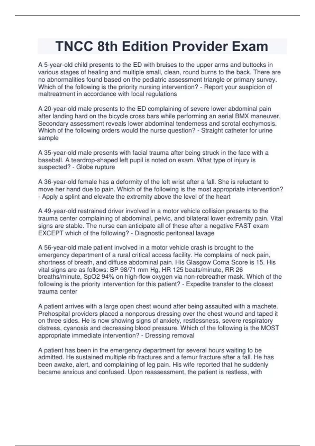 A 5-year-old child presents to the ED with bruises to the upper arms and buttocks in various stages of healing and multiple small, clean, round burns to the back. There are no abnormalities found based on the pediatric assessment triangle or primary survey. Which of the following is the priority nursing intervention? - Report your suspicion of maltreatment in accordance with local regulations A 20-year-old male presents to the ED complaining of severe lower abdominal pain after landing hard on the bicycle cross bars while performing an aerial BMX maneuver. Secondary assessment reveals lower abdominal tenderness and scrotal ecchymosis. Which of the following orders would the nurse question? - Straight catheter for urine sample A 35-year-old male presents with facial trauma after being struck in the face with a baseball. A teardrop-shaped left pupil is noted on exam. What type of injury is suspected? - Globe rupture A 36-year-old female has a deformity of the left wrist after a fall. She is reluctant to move her hand due to pain. Which of the following is the most appropriate intervention? - Apply a splint and elevate the extremity above the level of the heart A 49-year-old restrained driver involved in a motor vehicle collision presents to the trauma center complaining of abdominal, pelvic, and bilateral lower extremity pain. Vital signs are stable. The nurse can anticipate all of these after a negative FAST exam EXCEPT which of the following? - Diagnostic peritoneal lavage A 56-year-old male patient involved in a motor vehicle crash is brought to the emergency department of a rural critical access facility. He complains of neck pain, shortness of breath, and diffuse abdominal pain. His Glasgow Coma Score is 15. His vital signs are as follows: BP 98/71 mm Hg, HR 125 beats/minute, RR 26 breaths/minute, SpO2 94% on high-flow oxygen via non-rebreather mask. Which of the following is the priority intervention for this patient? - Expedite transfer to the closest trauma center A patient arrives with a large open chest wound after being assaulted with a machete. Prehospital providers placed a nonporous dressing over the chest wound and taped it on three sides. He is now showing signs of anxiety, restlessness, severe respiratory distress, cyanosis and decreasing blood pressure. Which of the following is the MOST appropriate immediate intervention? - Dressing removal A patient has been in the emergency department for several hours waiting to be admitted. He sustained multiple rib fractures and a femur fracture after a fall. He has been awake, alert, and complaining of leg pain. His wife reported that he suddenly became anxious and confused. Upon reassessment, the patient is restless, with