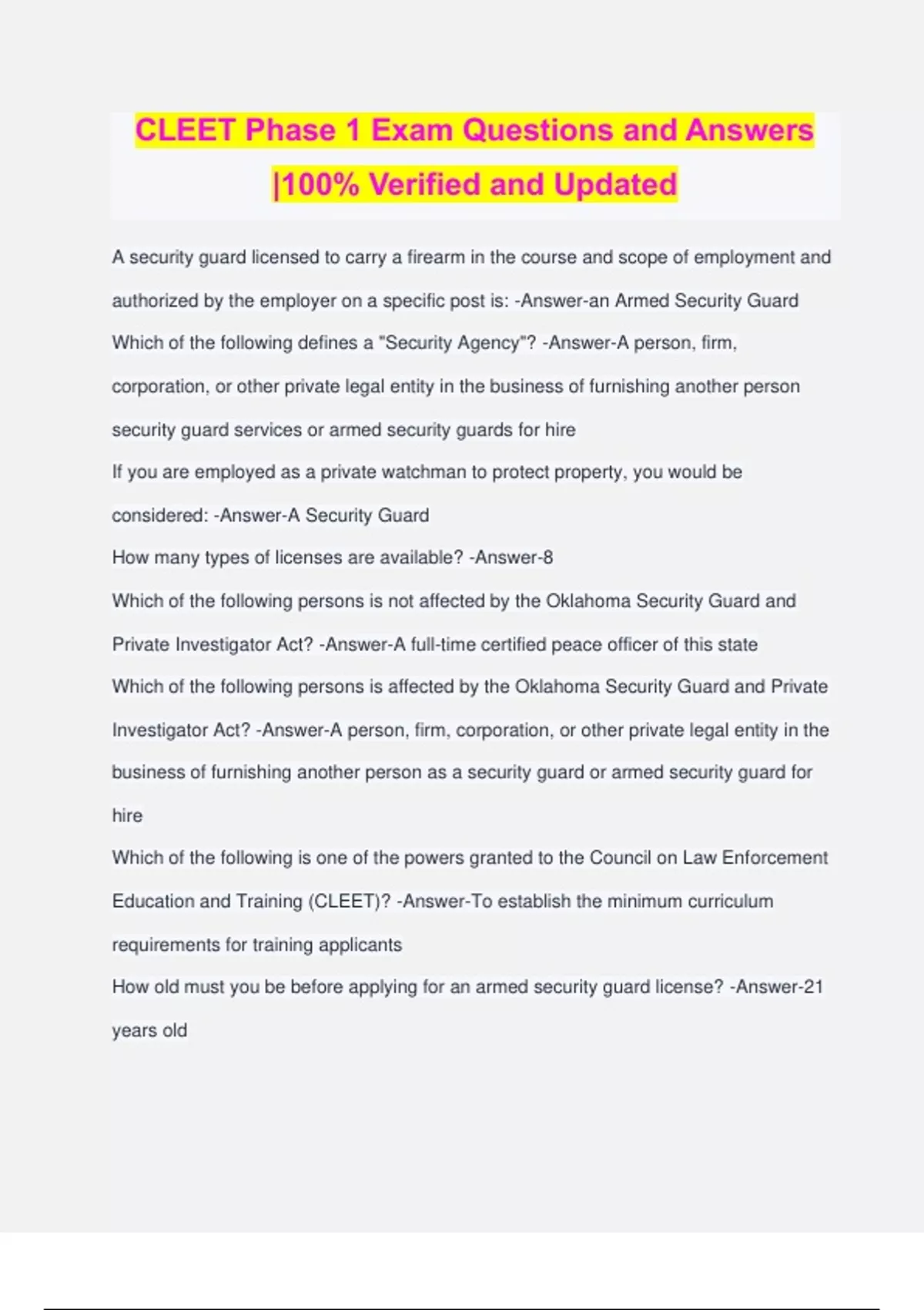 CLEET Phase 1 Exam Questions and Answers |100% Verified and Updated A security guard licensed to carry a firearm in the course and scope of employment and authorized by the employer on a specific post is: -Answer-an Armed Security Guard Which of the following defines a "Security Agency"? -Answer-A person, firm, corporation, or other private legal entity in the business of furnishing another person security guard services or armed security guards for hire If you are employed as a private watchman to protect property, you would be considered: -Answer-A Security Guard How many types of licenses are available? -Answer-8 Which of the following persons is not affected by the Oklahoma Security Guard and Private Investigator Act? -Answer-A full-time certified peace officer of this state Which of the following persons is affected by the Oklahoma Security Guard and Private Investigator Act? -Answer-A person, firm, corporation, or other private legal entity in the business of furnishing another person as a security guard or armed security guard for hire Which of the following is one of the powers granted to the Council on Law Enforcement Education and Training (CLEET)? -Answer-To establish the minimum curriculum requirements for training applicants How old must you be before applying for an armed security guard license? -Answer-21 years old How old must you be before applying for a security guard (unarmed) or special event license? -Answer-18 years old Which of the following is a qualification that license applicants must meet? -Answer-be of good moral character May applicant information be disclosed to a licensing authority in another jurisdiction? - Answer-Yes May applicant information be disclosed to the public to verify the current license status of any applicant or licensee? -Answer-Yes Who is required to complete a psychological evaluation? -Answer-persons applying for the Armed Security Guard license For how long from the date of your evaluation can the CLEET use the results before you must be reexamined? -Answer-Up to 6 months Which of the following licenses has the highest original fee? -Answer-Security Agency For how long is the Security Guard license valid? -Answer-3 years and may be renewed for 3 year terms For how long is the Conditional License valid? -Answer-6 months and cannot be renewed How many special event licenses may be issued to one person in a calendar year? - Answer-No more than 2 Which of the following can be displayed on a security guard badge or uniform? -Answer- Security Officer Which can be displayed on a security vehicle? -Answer-Guard Which of the following is a guideline for providing first aid? -Answer-Do not give first aid if the victim refuses consent Which of the following is a guideline for providing first aid? -Answer-Contac